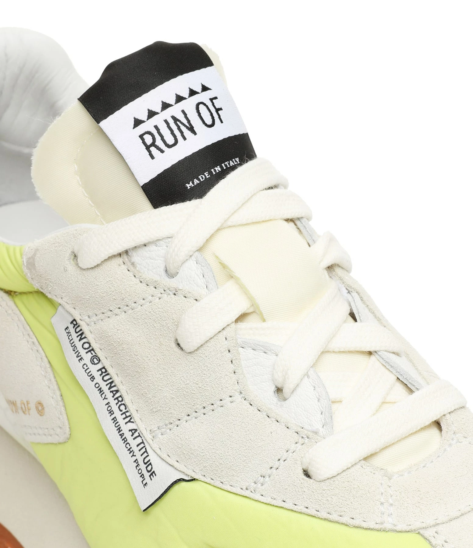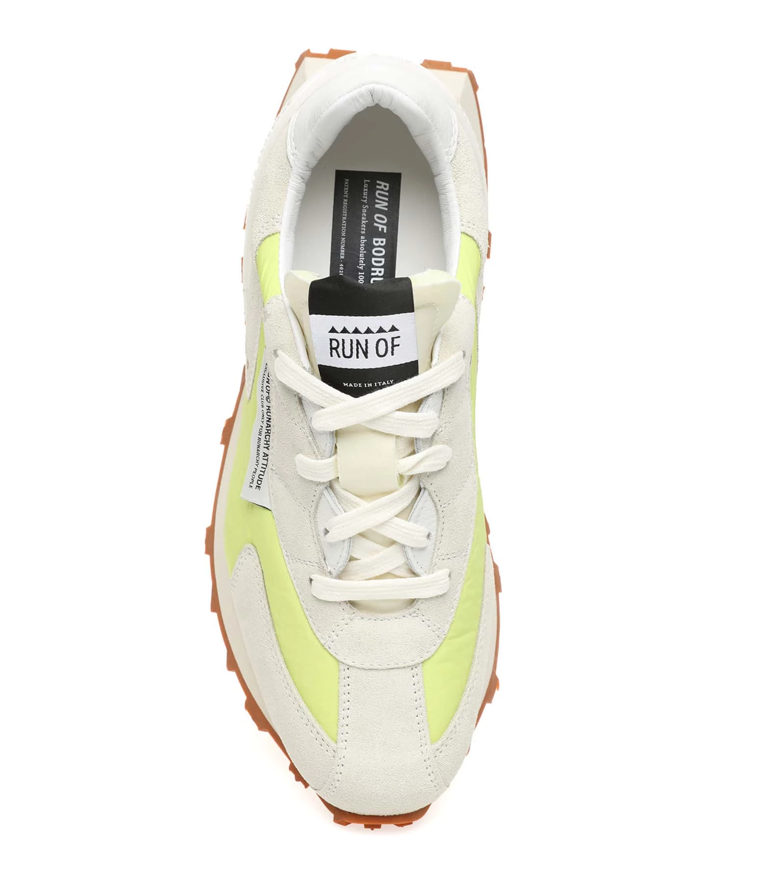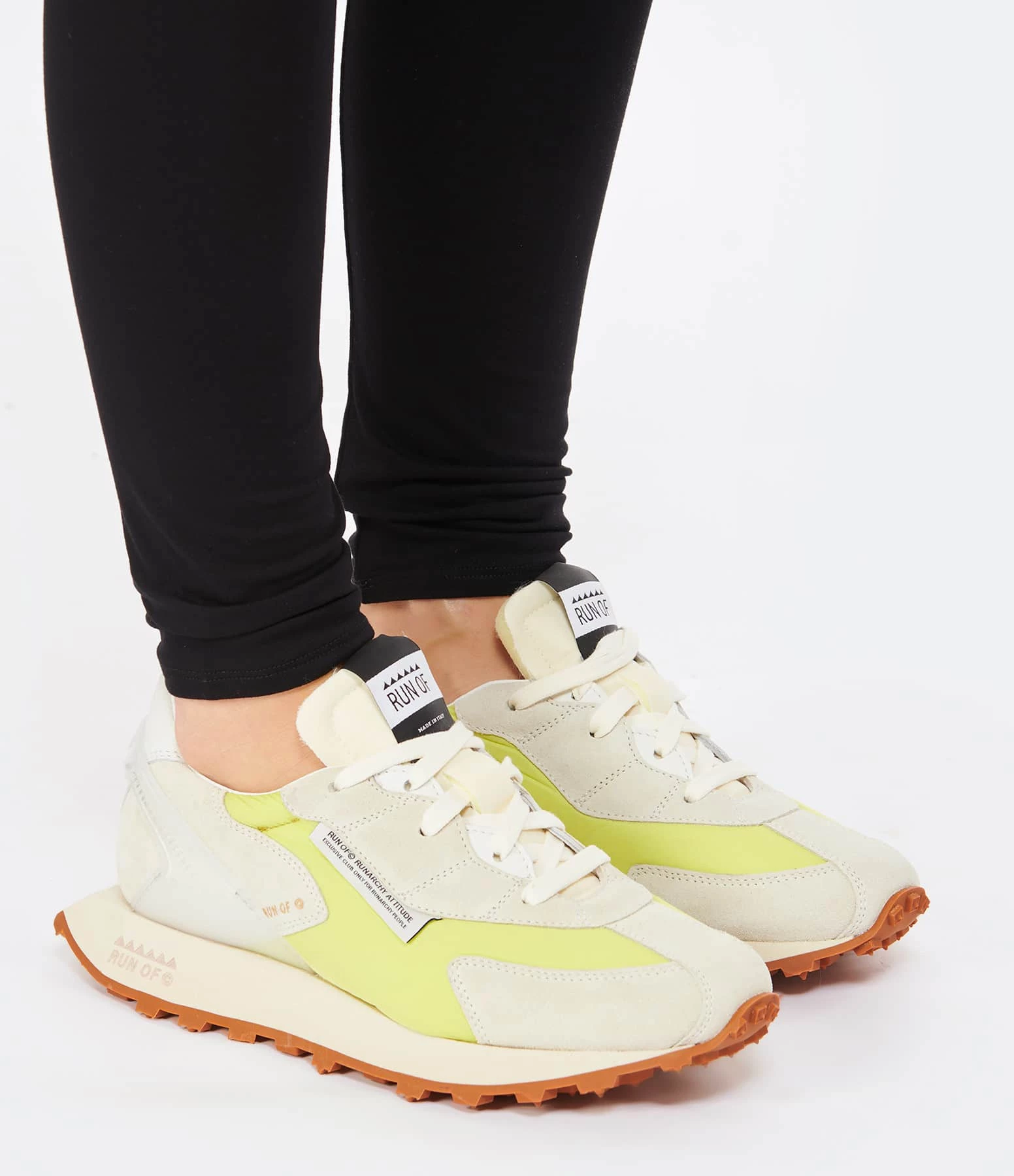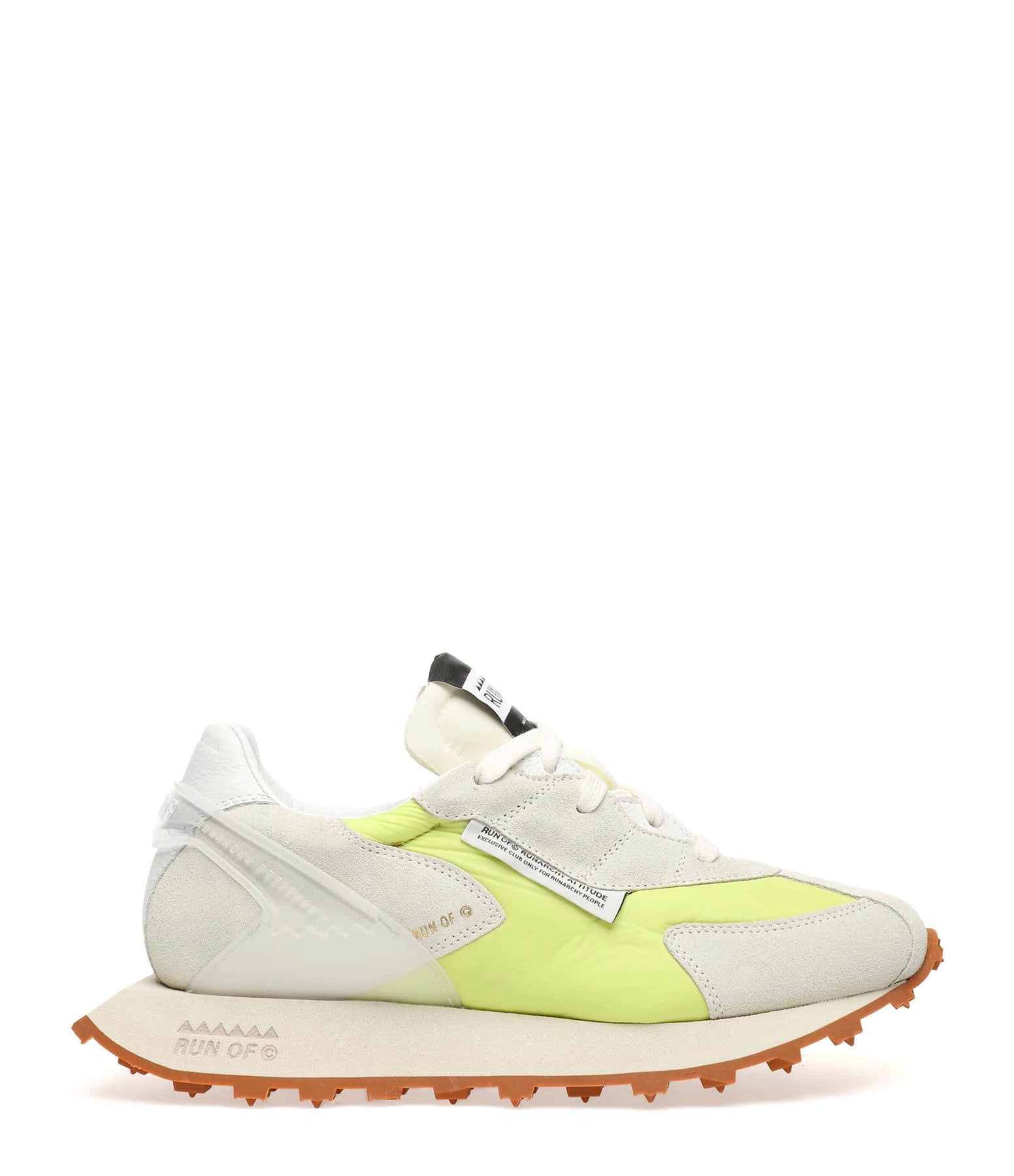 Baskets running grise et jaune fluo à empiècements contrastants multi-matières. Renfort en plastique transparent au talon. Lacets gris. Semelle en caoutchouc crantée.