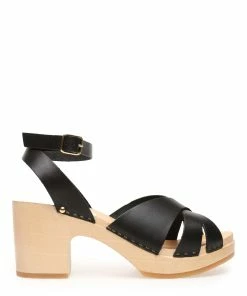 Sandales en bois et cuir noir. Deux brides croisées à l’avant et une bride réglable à la cheville. Agrafes dorés de chaque côté.