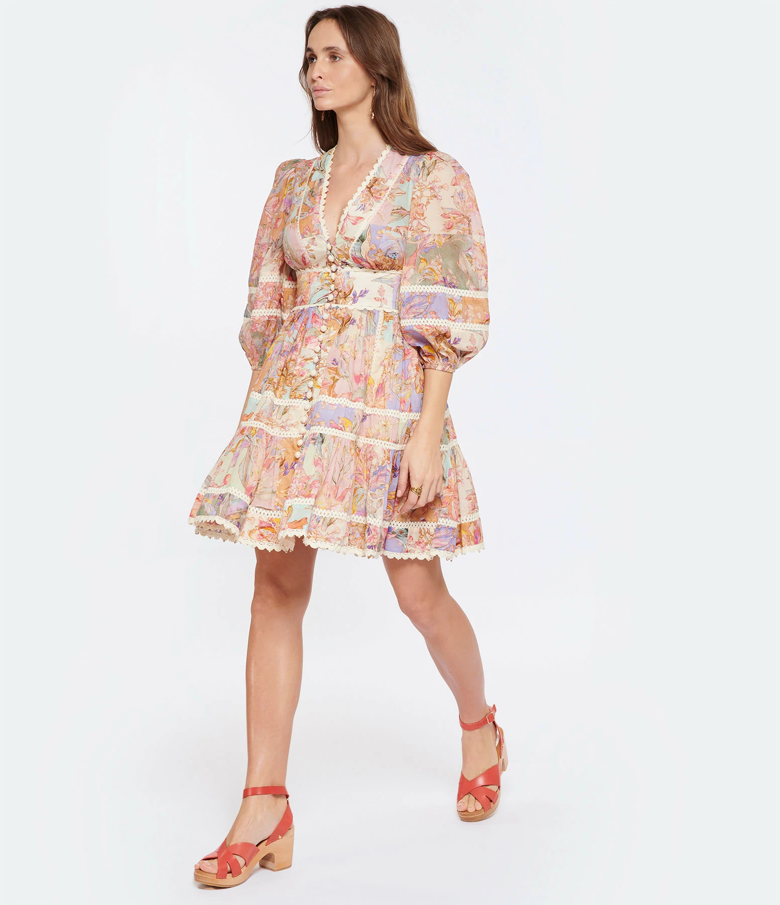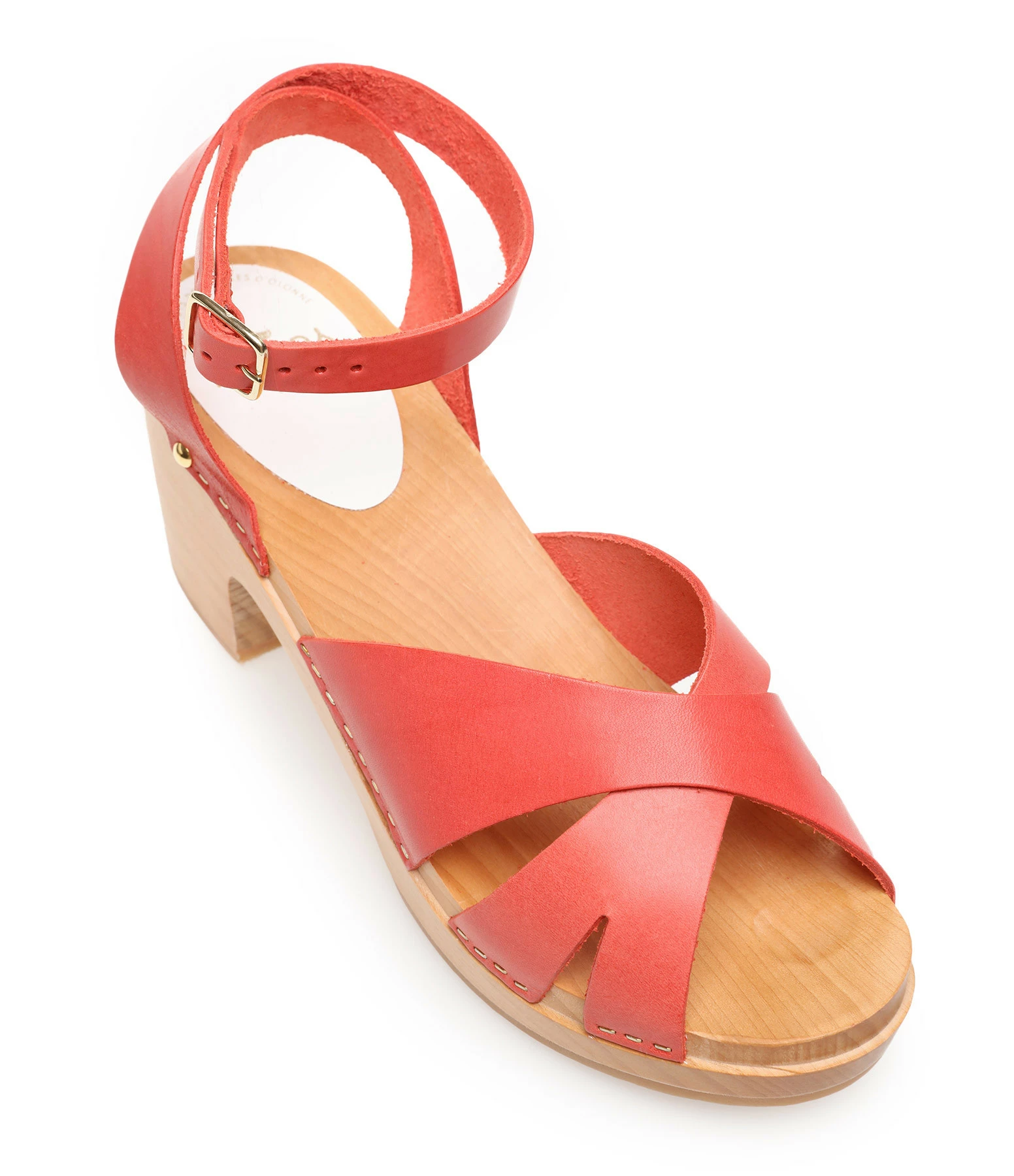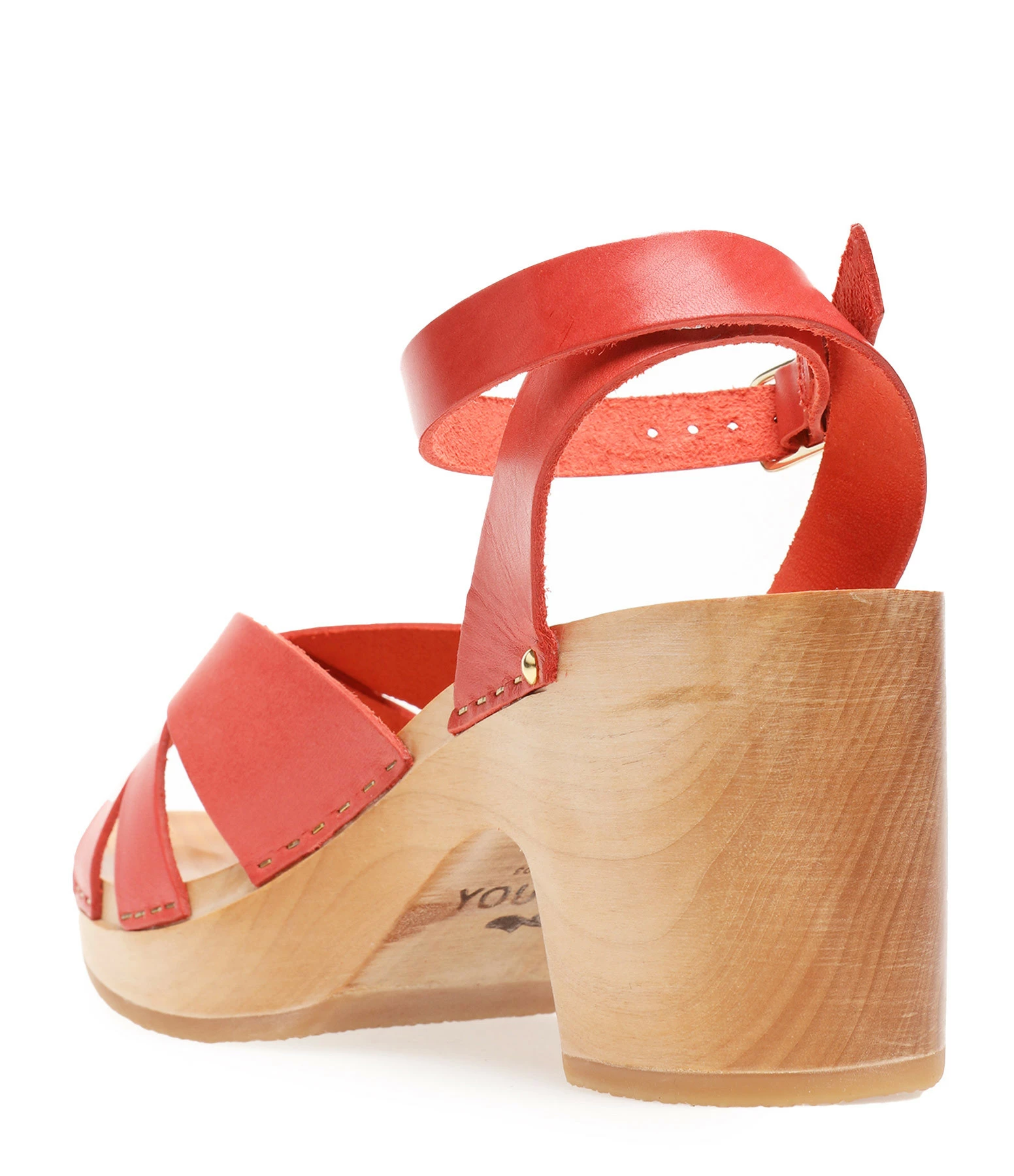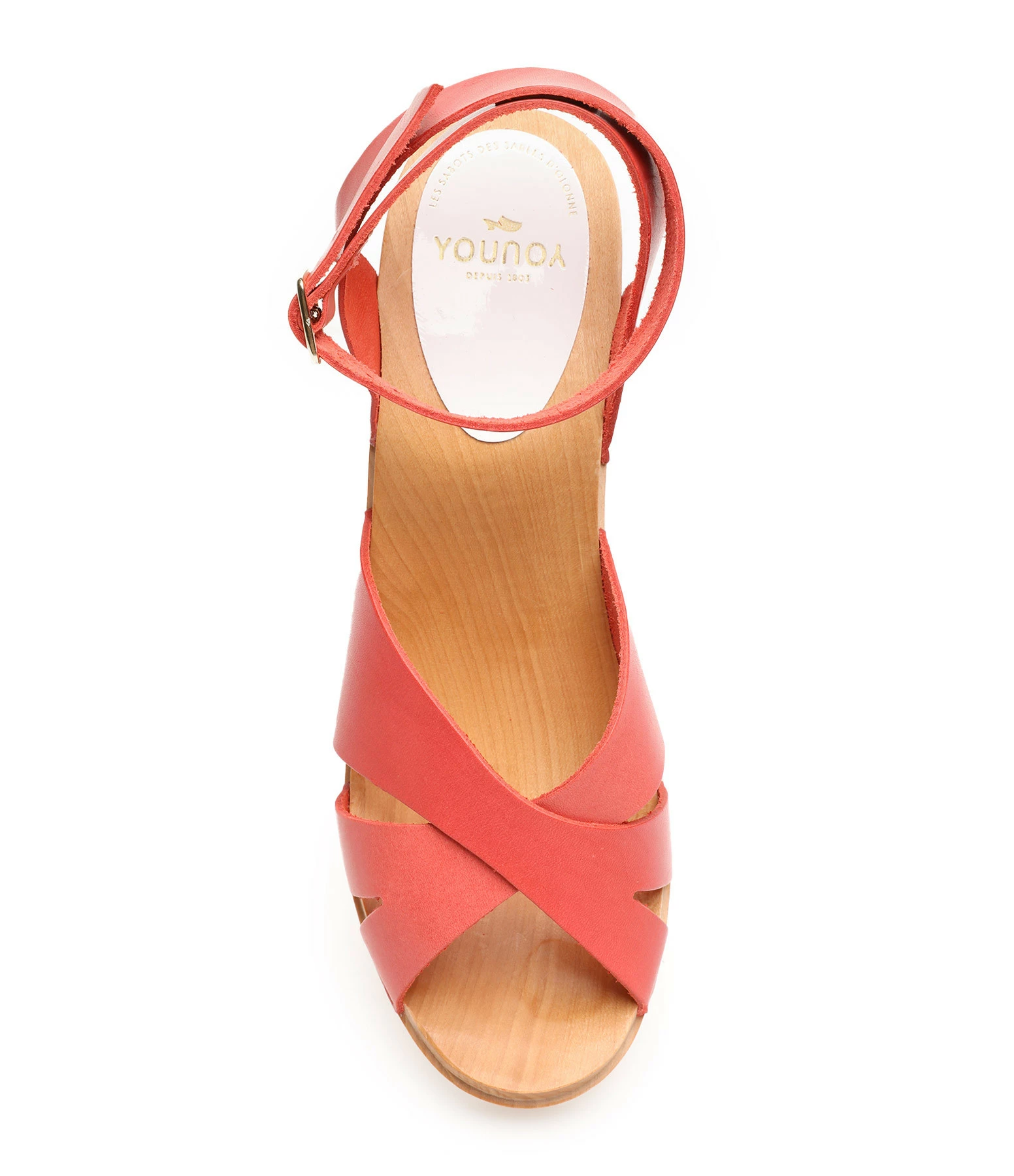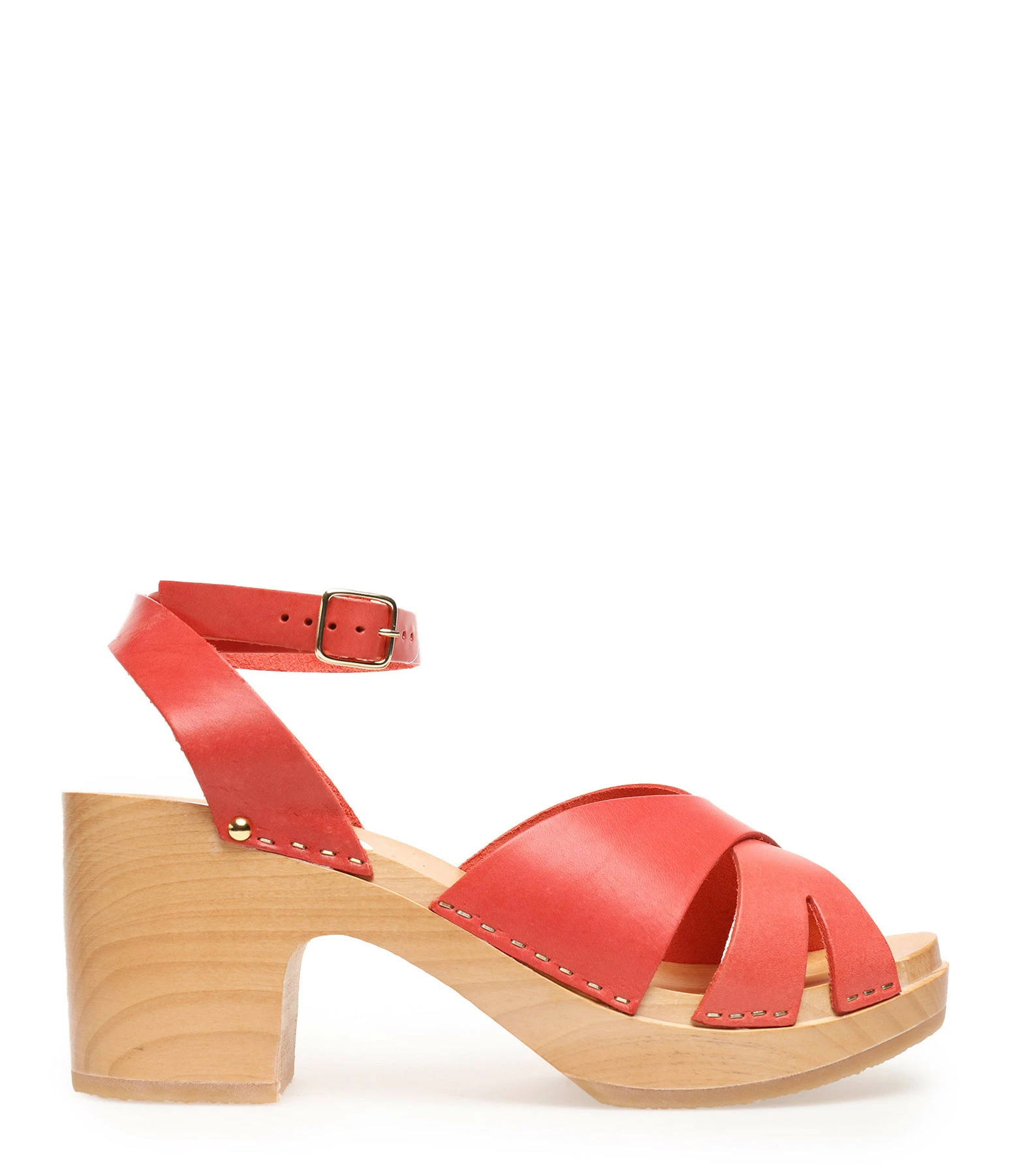 Sandales en bois et cuir rouge corail. Deux brides croisées à l’avant et une bride réglable à la cheville. Agrafes dorés de chaque côté.