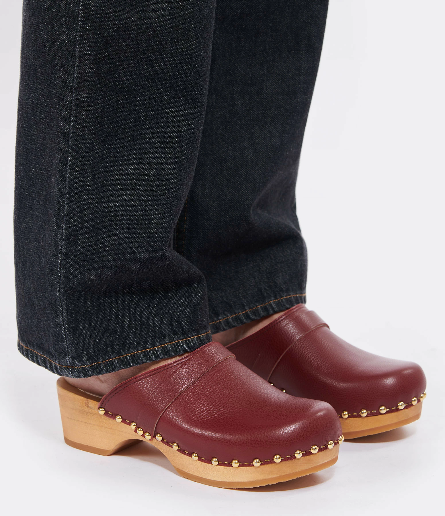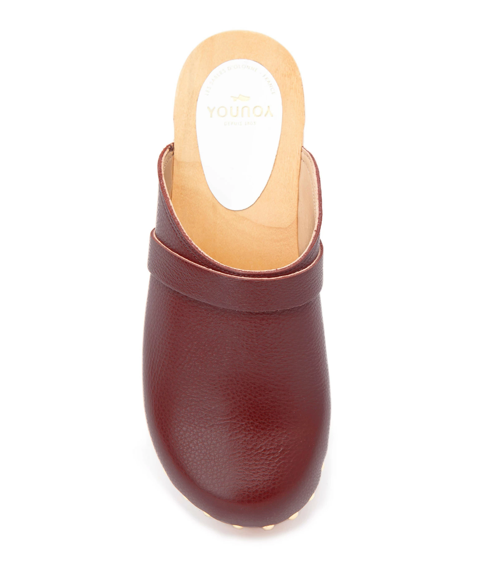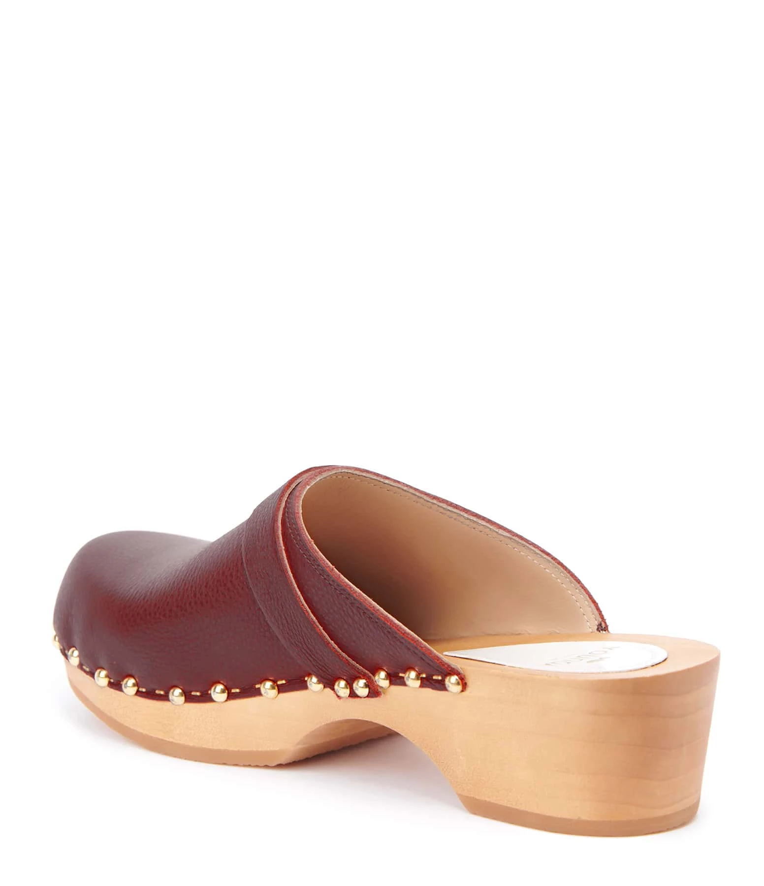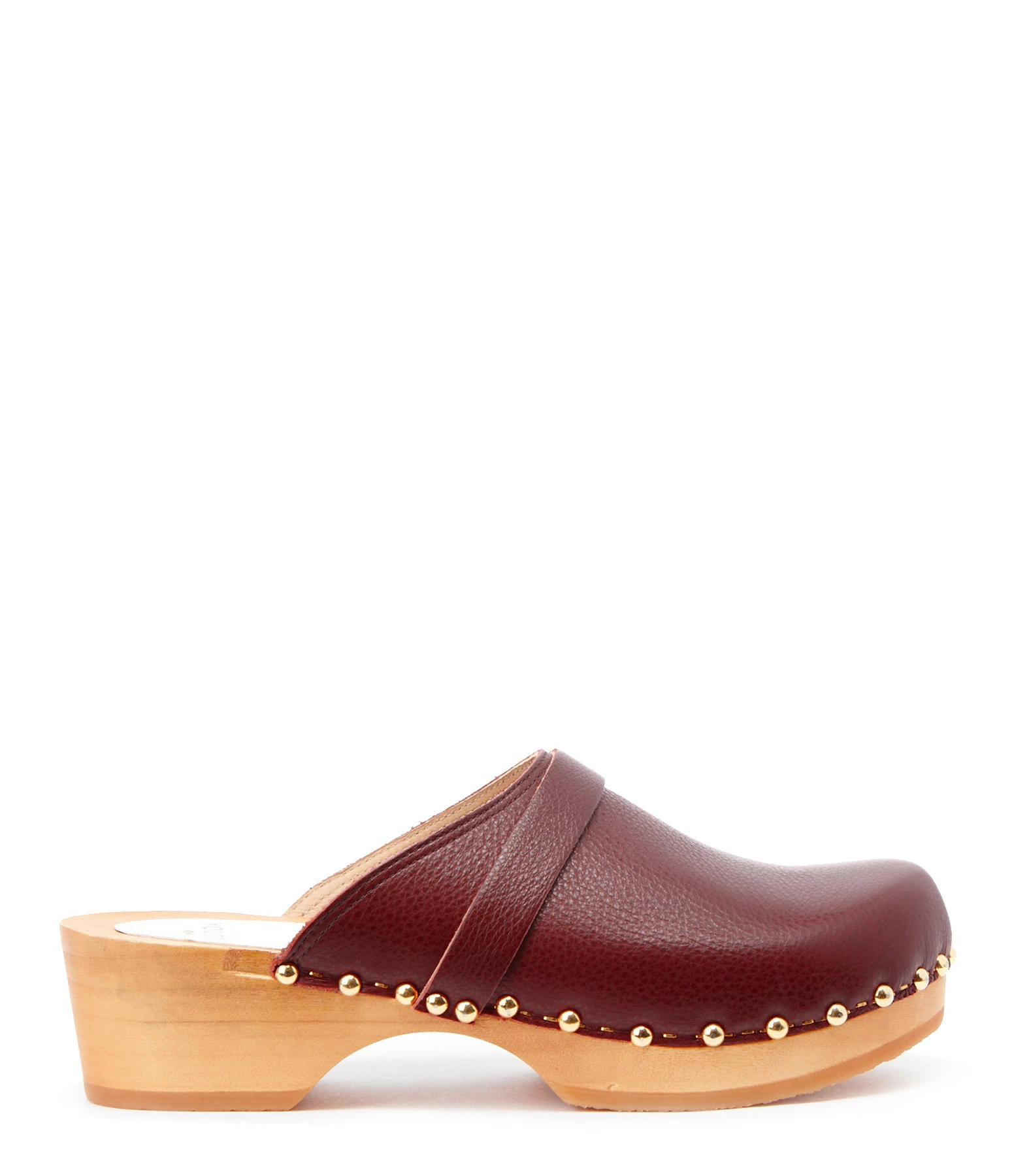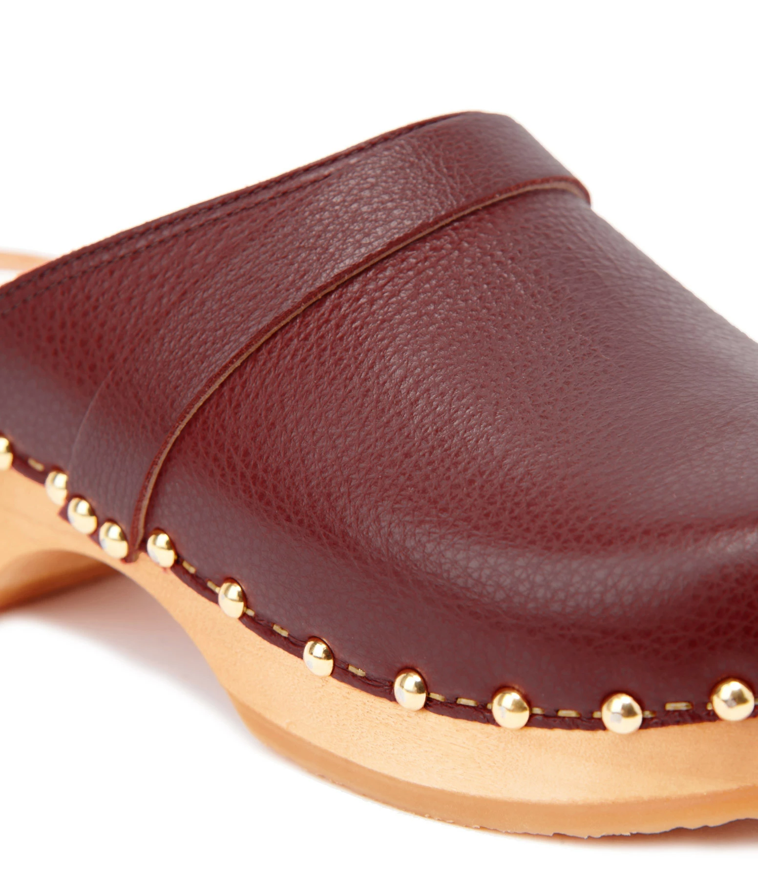 Sabot en cuir rouge foncé. Clous et agrafes dorés sur le bord.