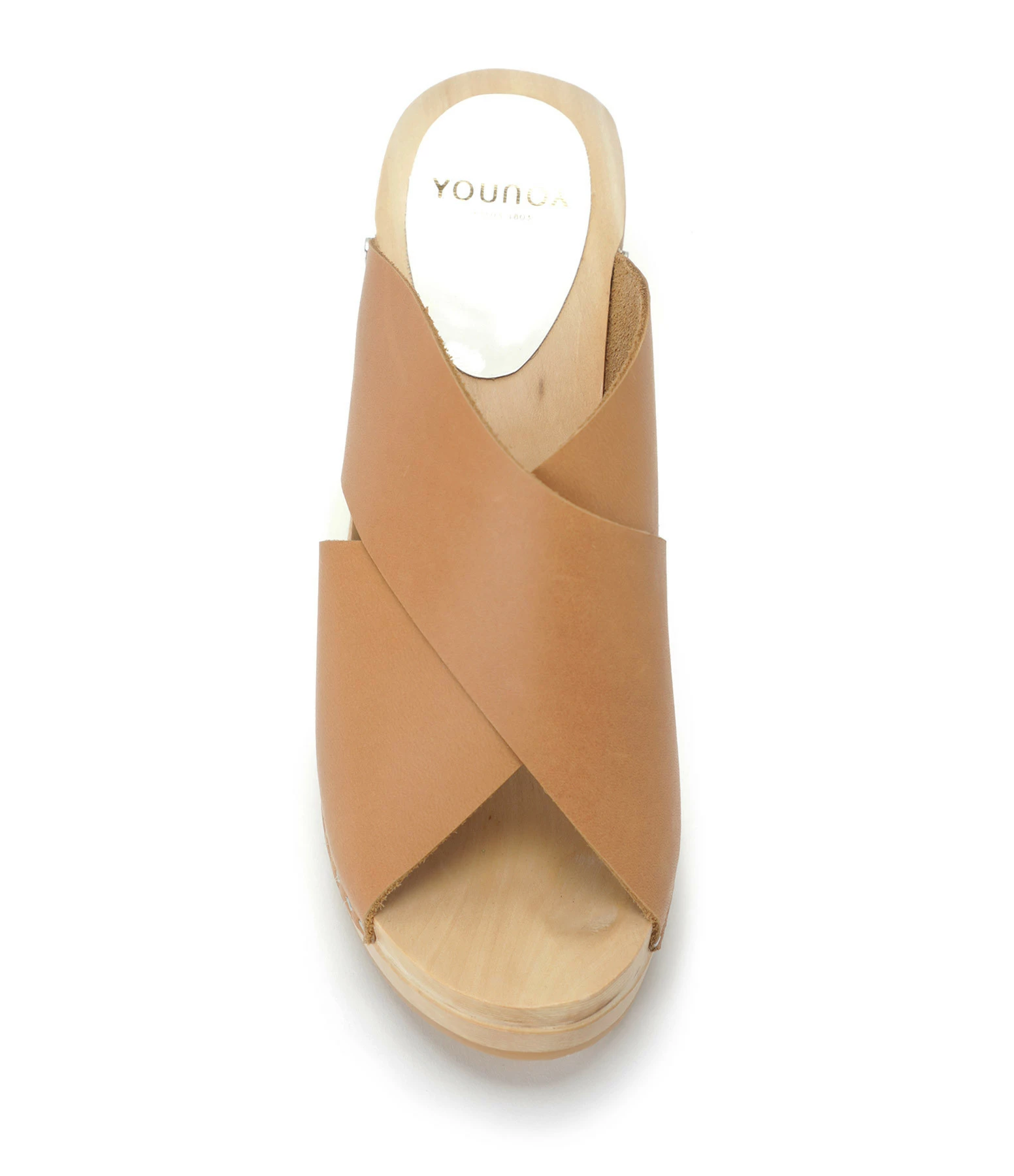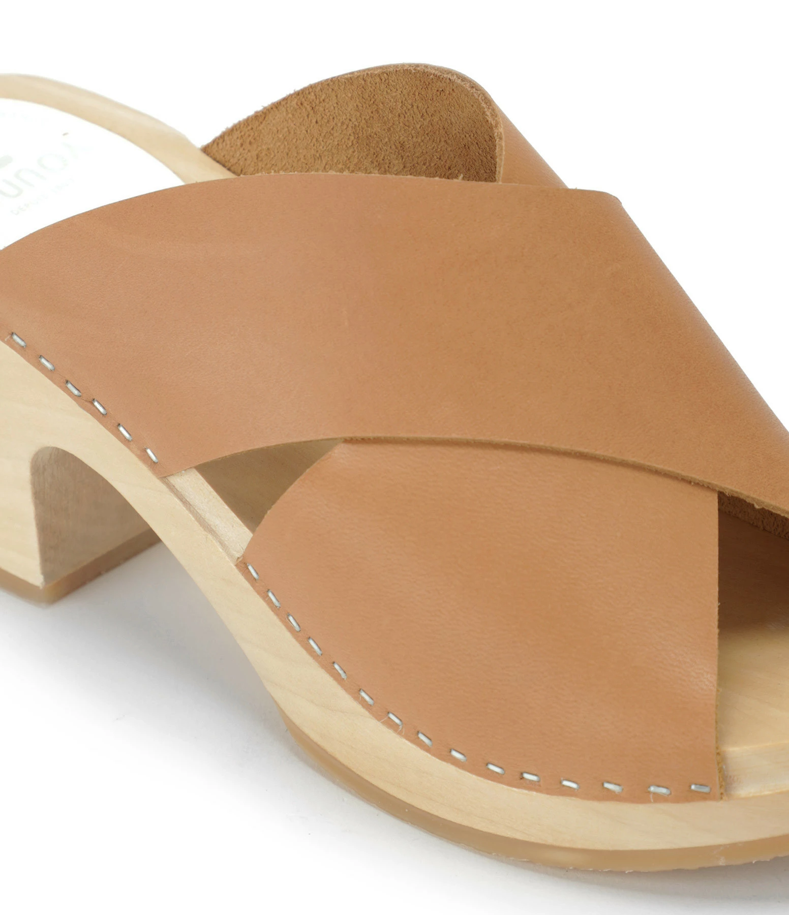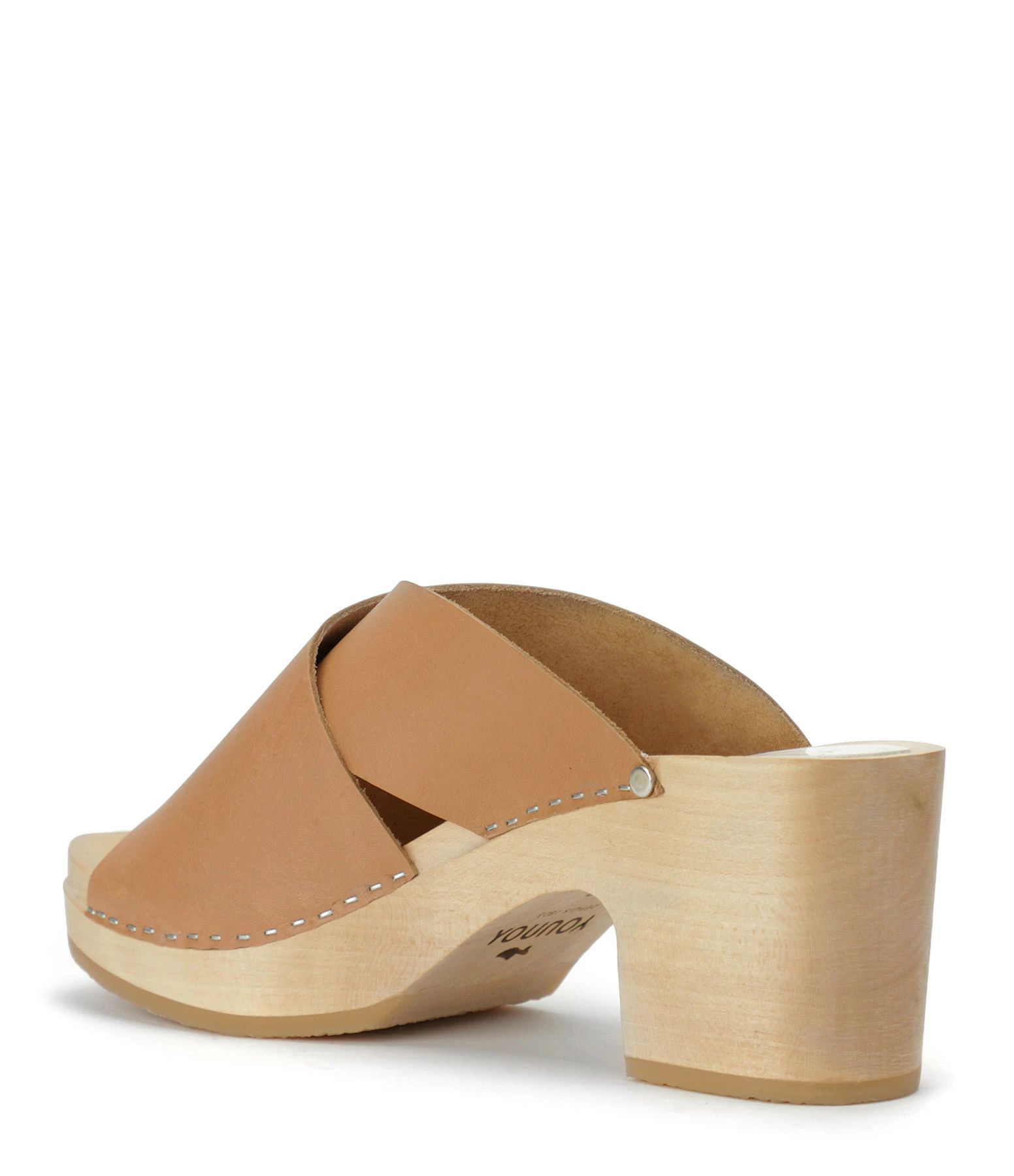 Mules à talons en bois et cuir naturel. Deux bandes de cuir croisées. Clous argentés de chaque coté.
