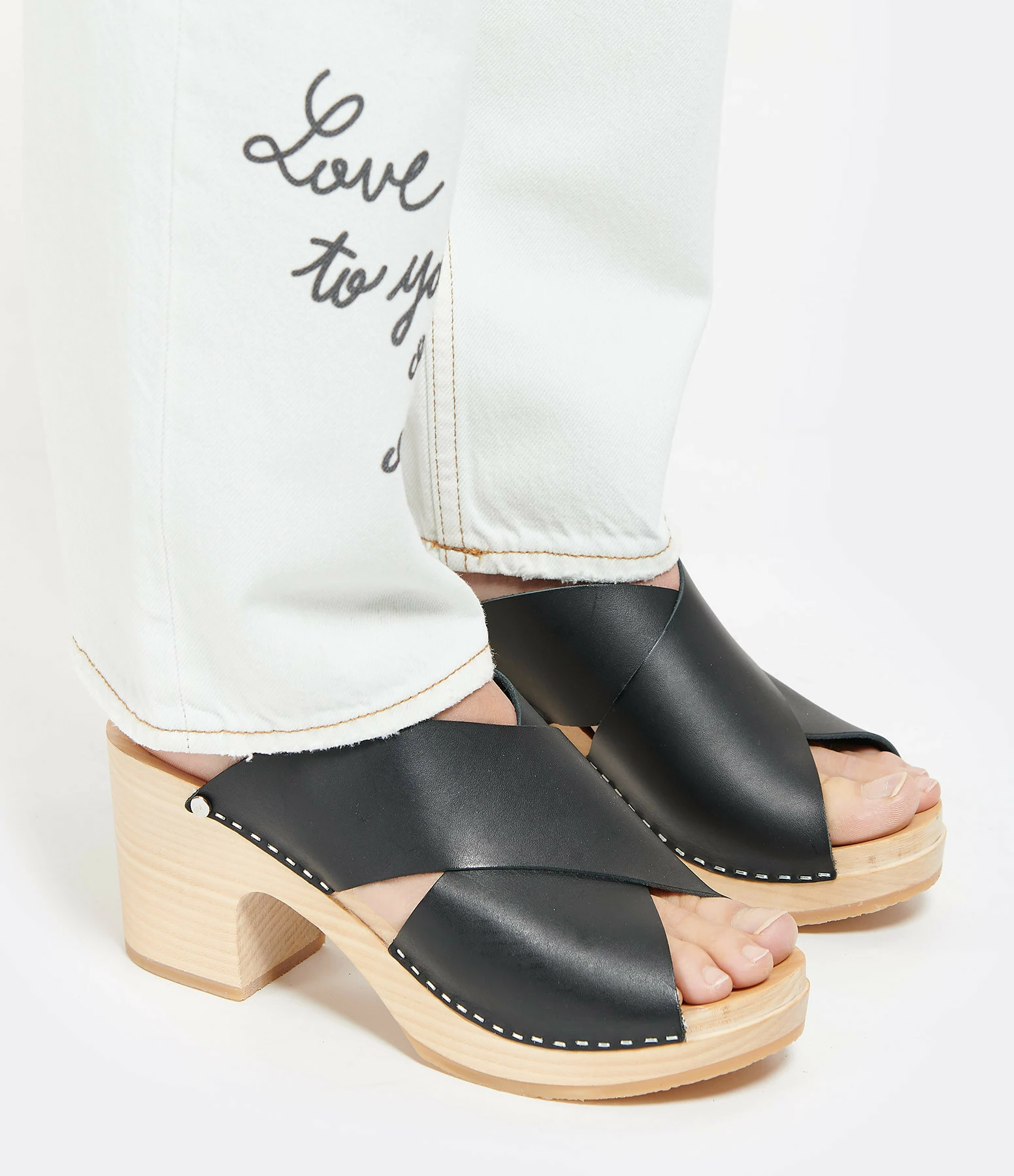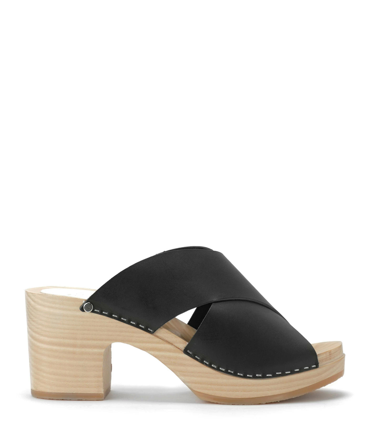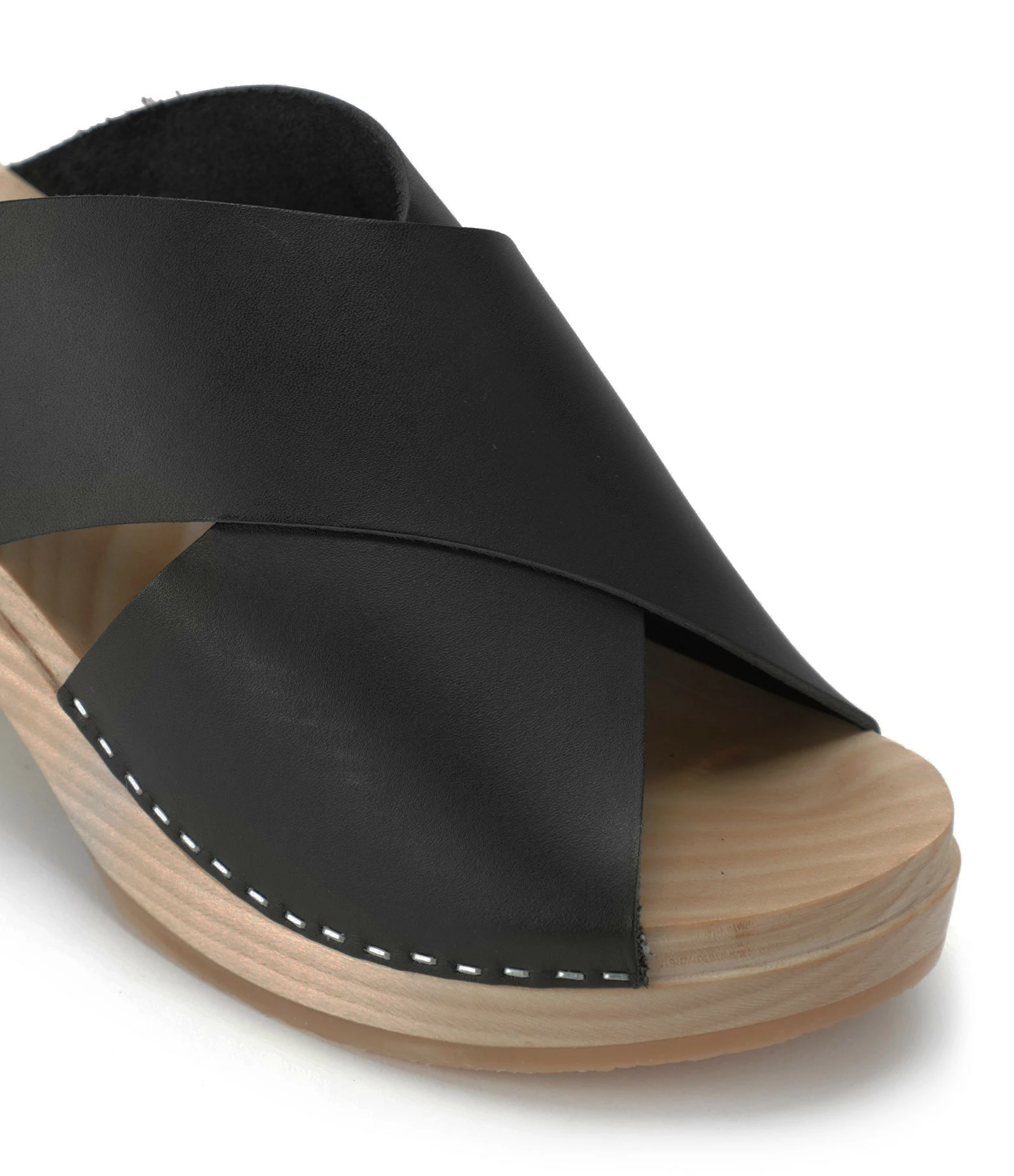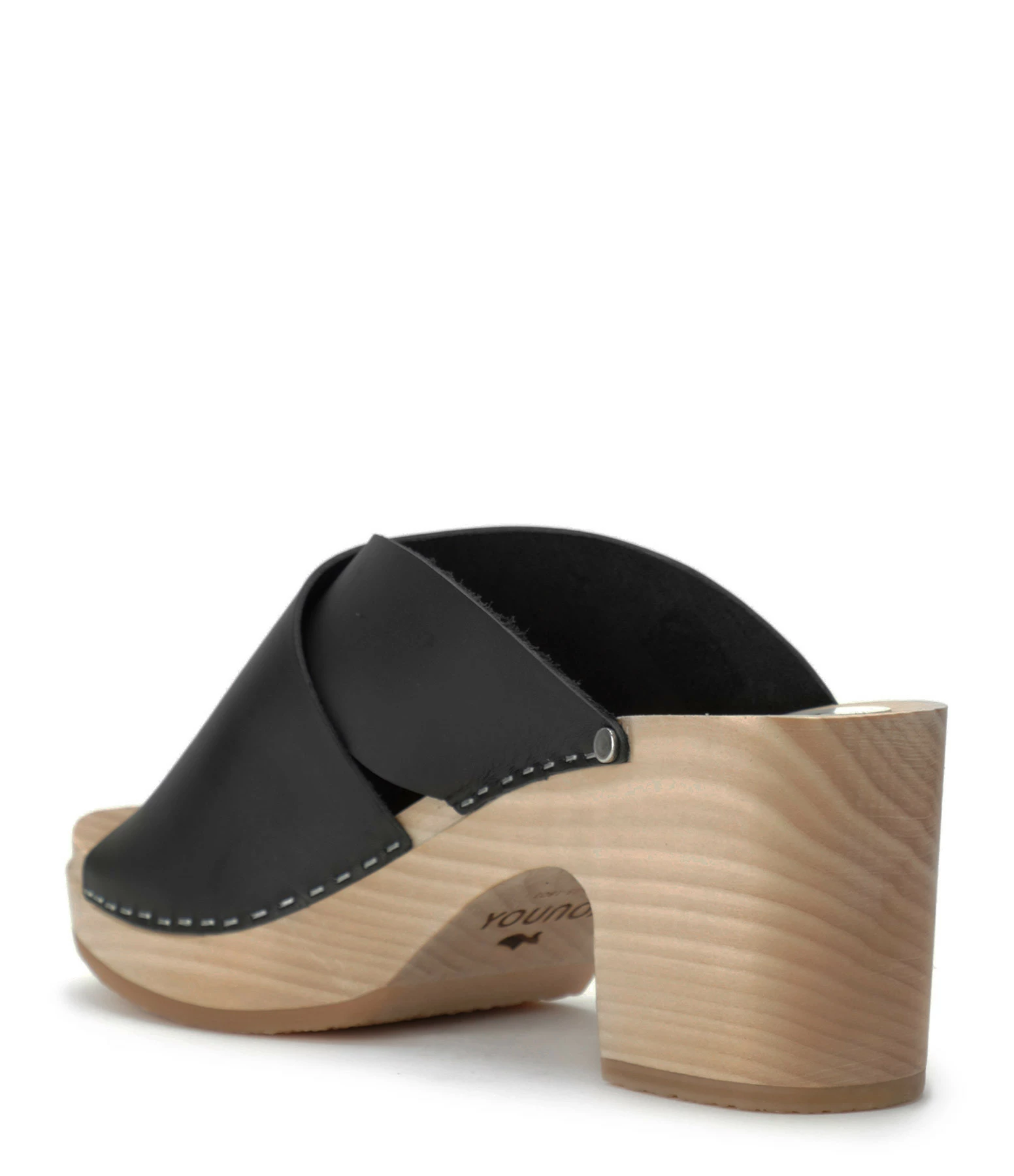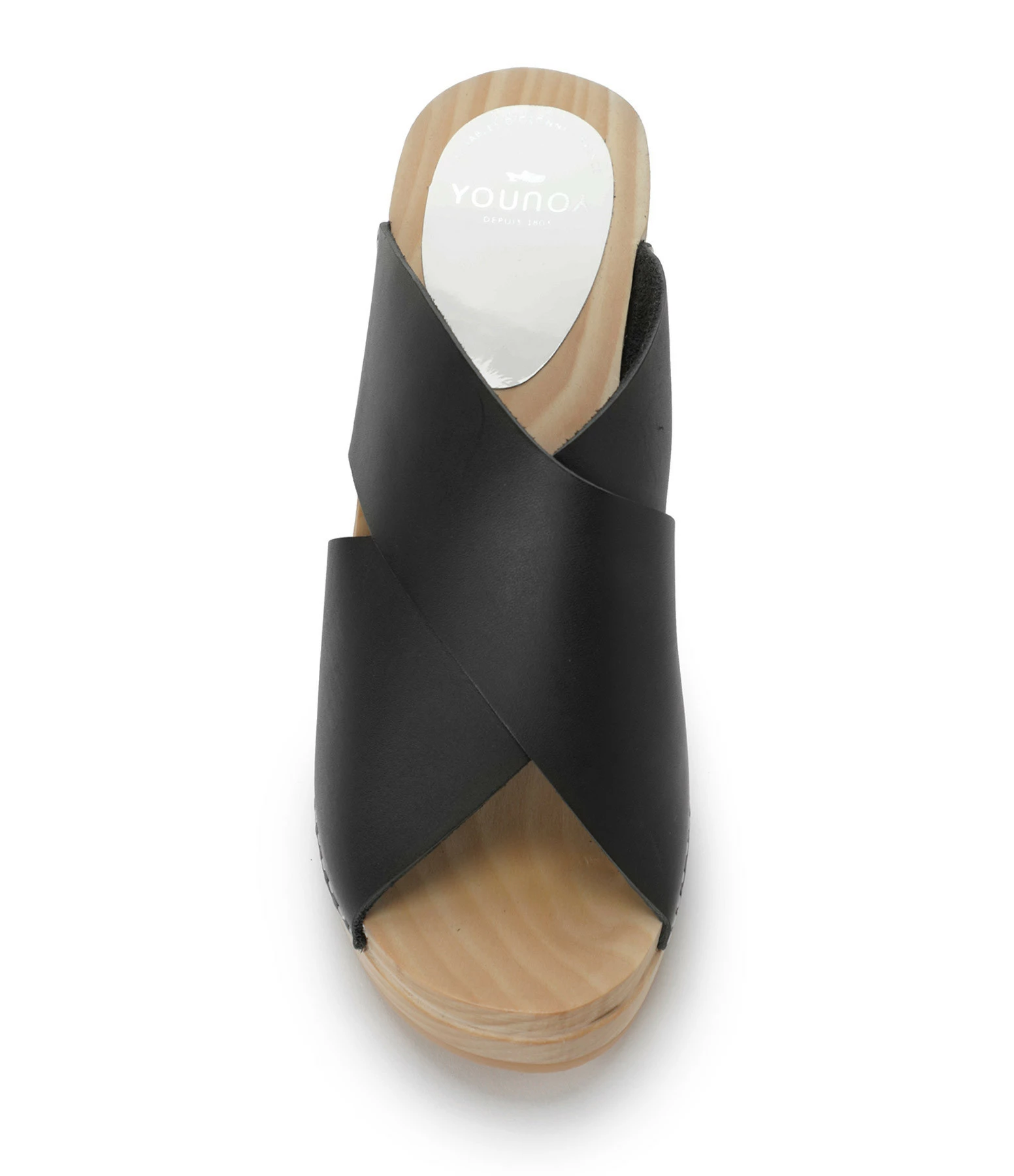 Mules à talons en bois et cuir noir. Deux bandes de cuir croisées. Clous argentés de chaque côté.