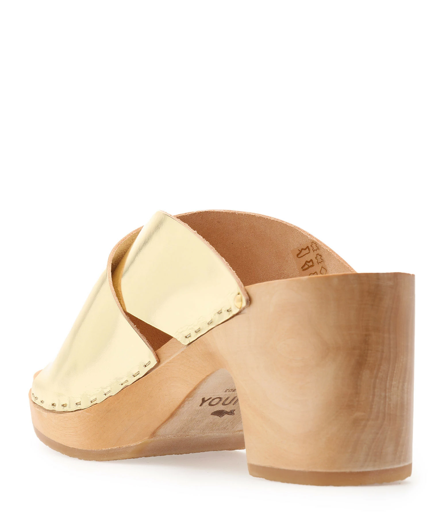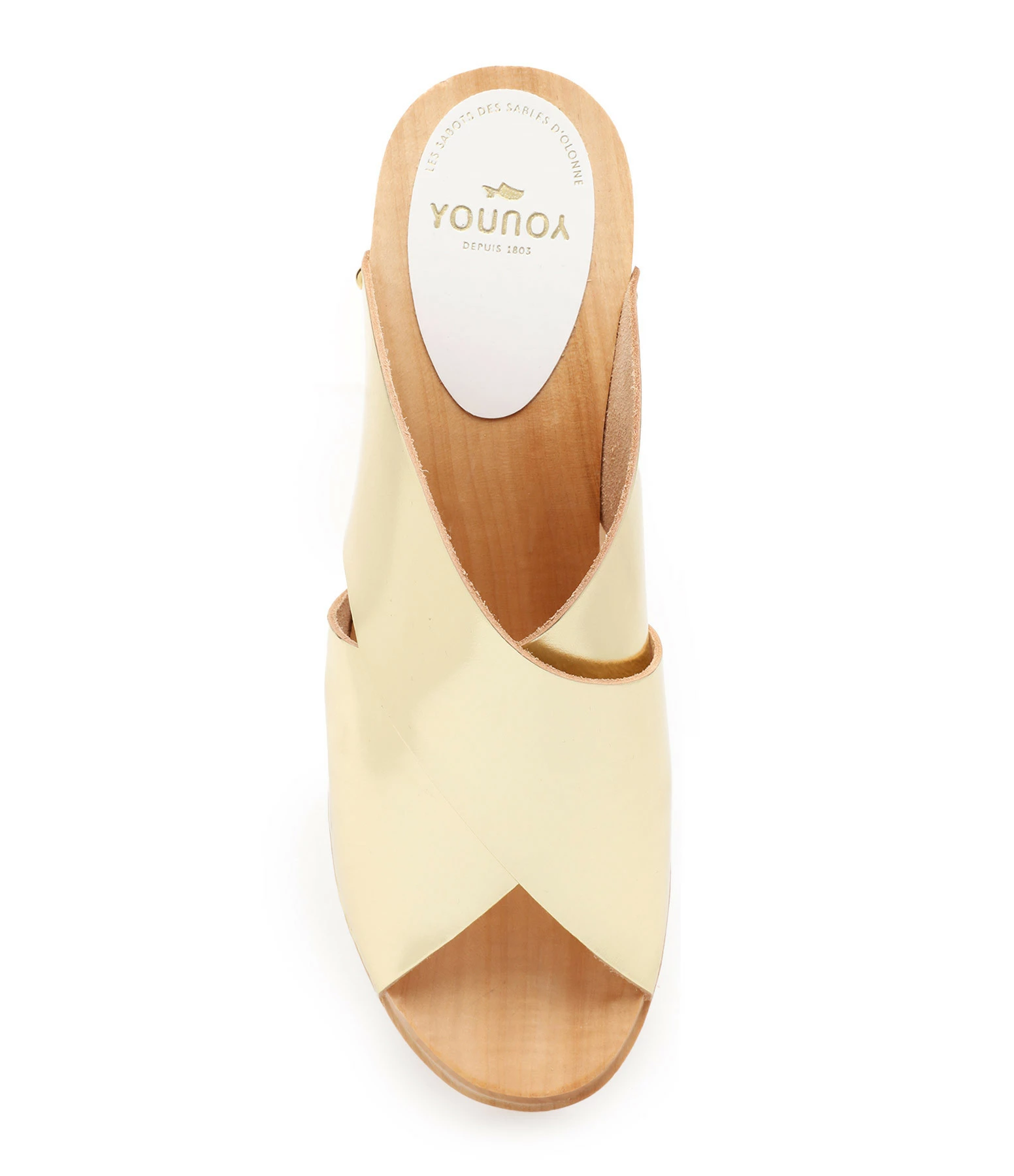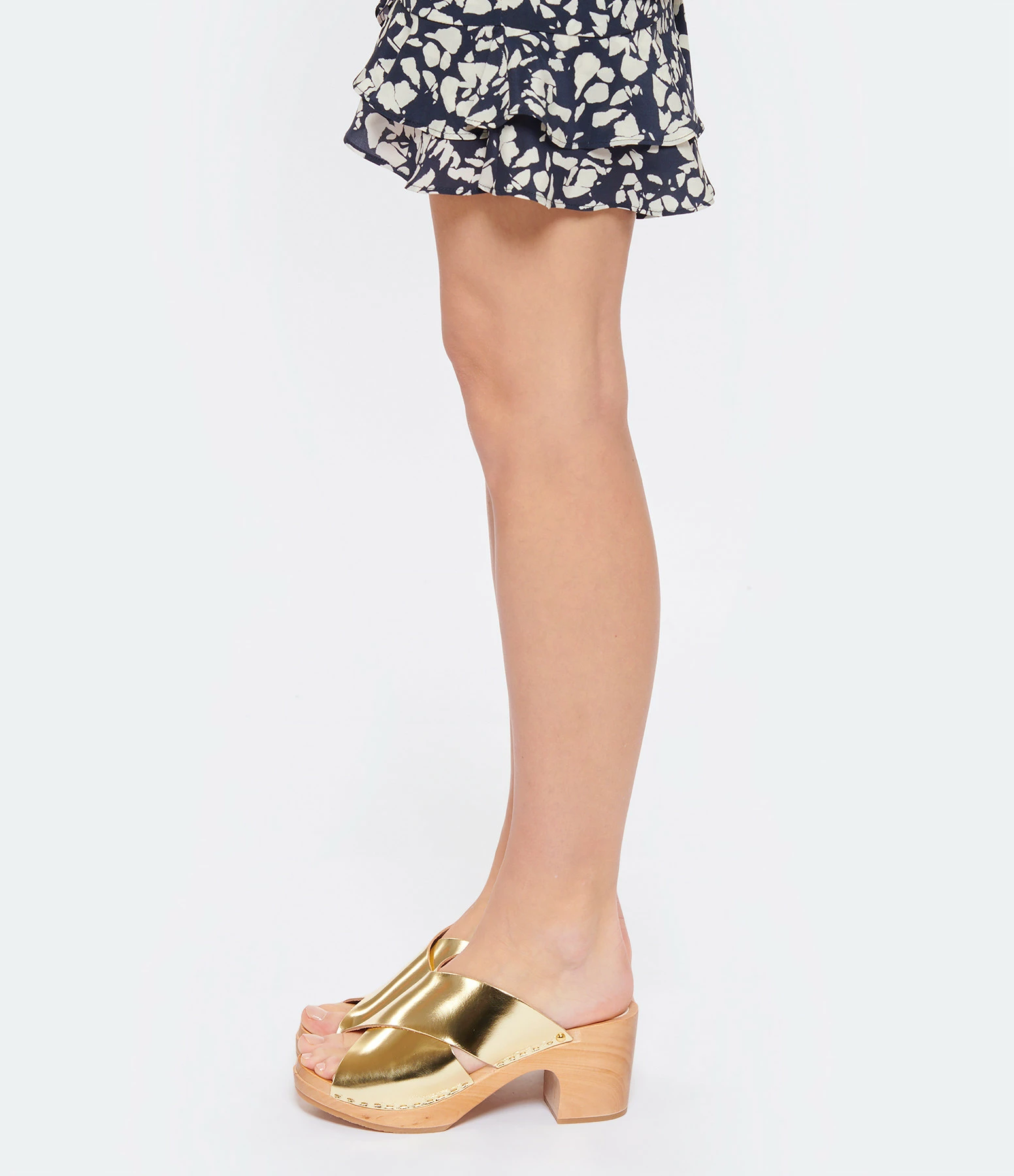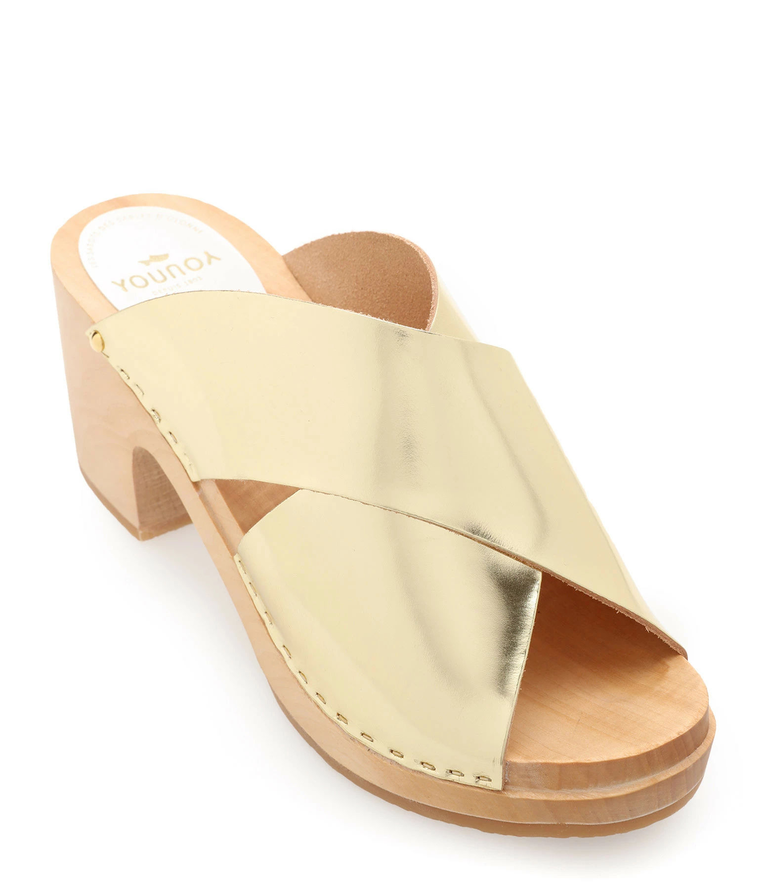 Mules à talons en bois et cuir doré. Deux bandes de cuir croisées. Agrafes dorés de chaque côté.