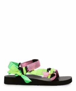 Sandales à brides enroulées de tissu fluo. Nœuds décoratifs. Attache à scratch autour de la cheville. Semelle en mousse recyclée.