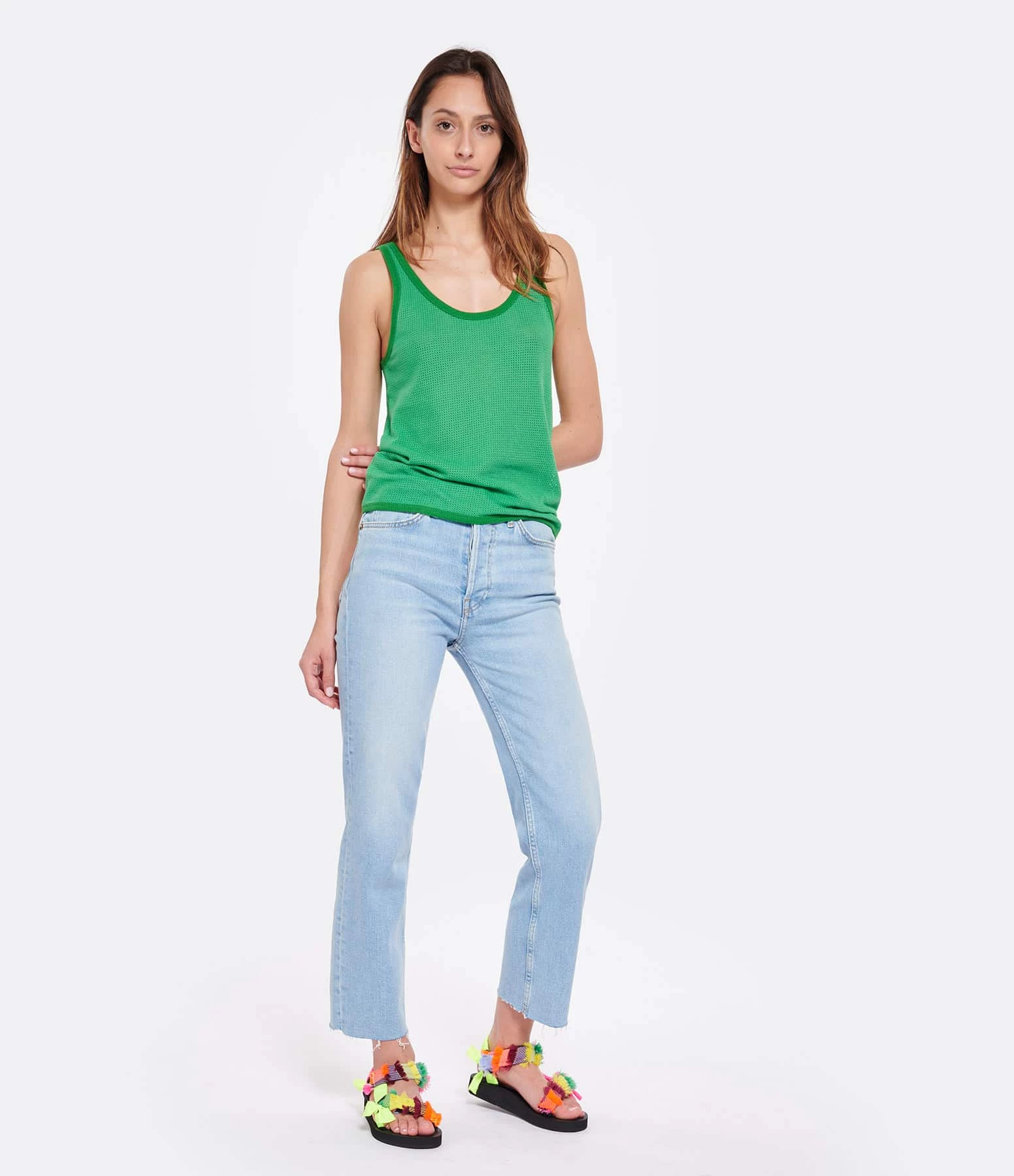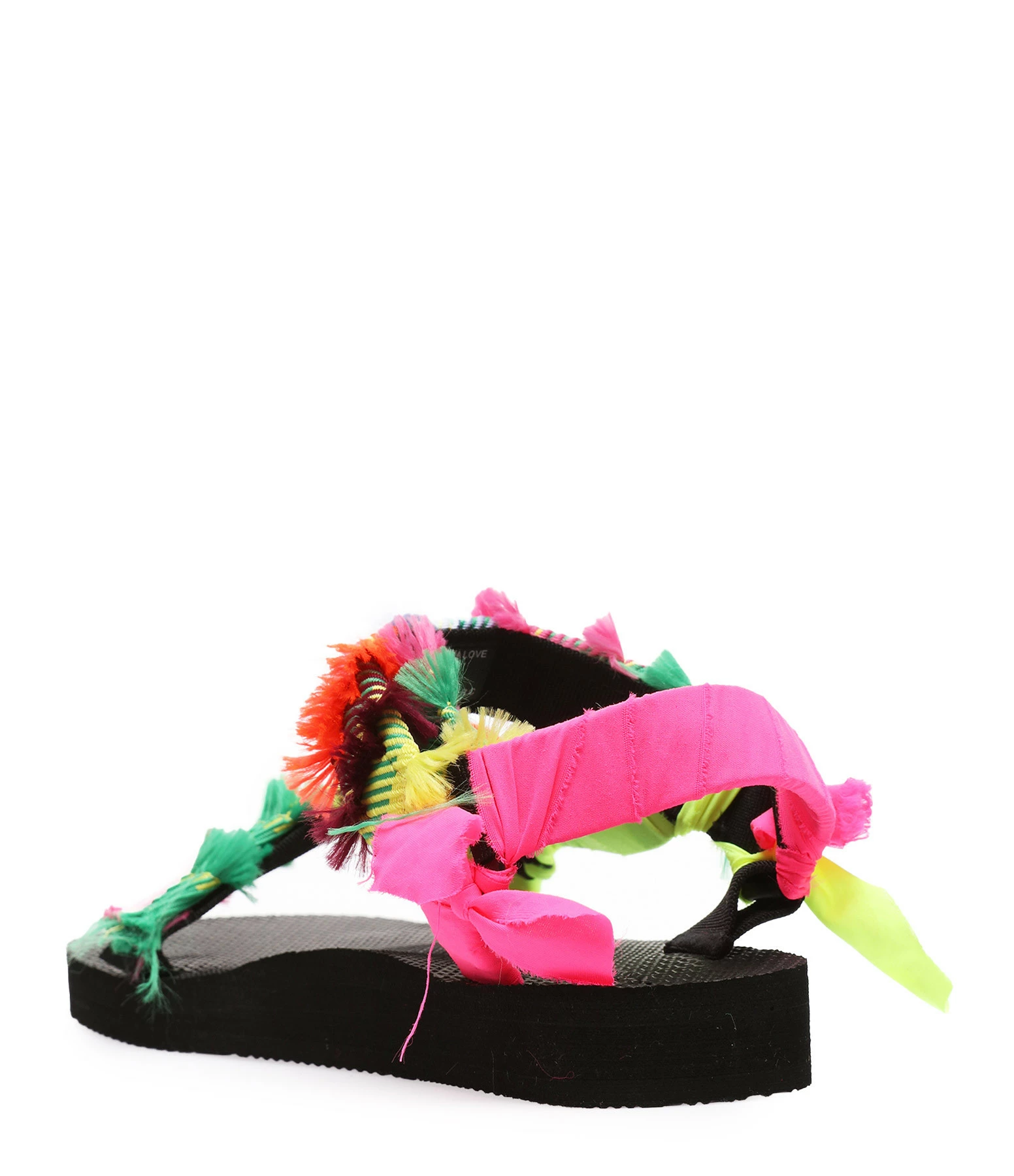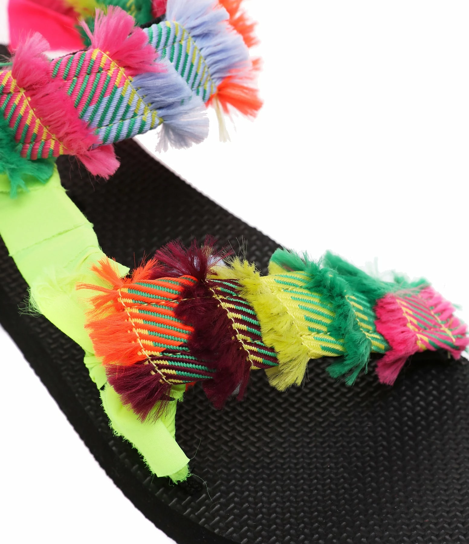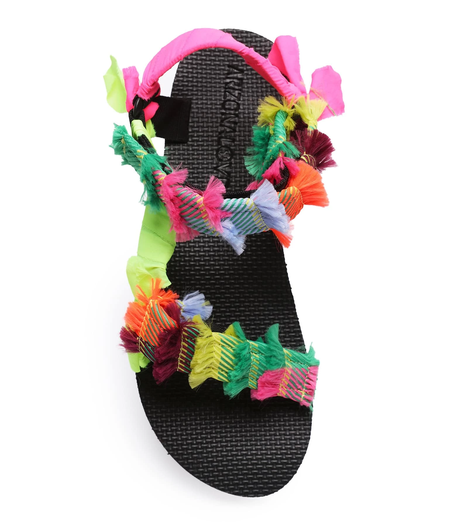 Sandales à brides enroulées de tissu fluo et franges multicolores. Nœuds décoratifs. Attache à scratch autour de la cheville. Semelle en mousse recyclée.