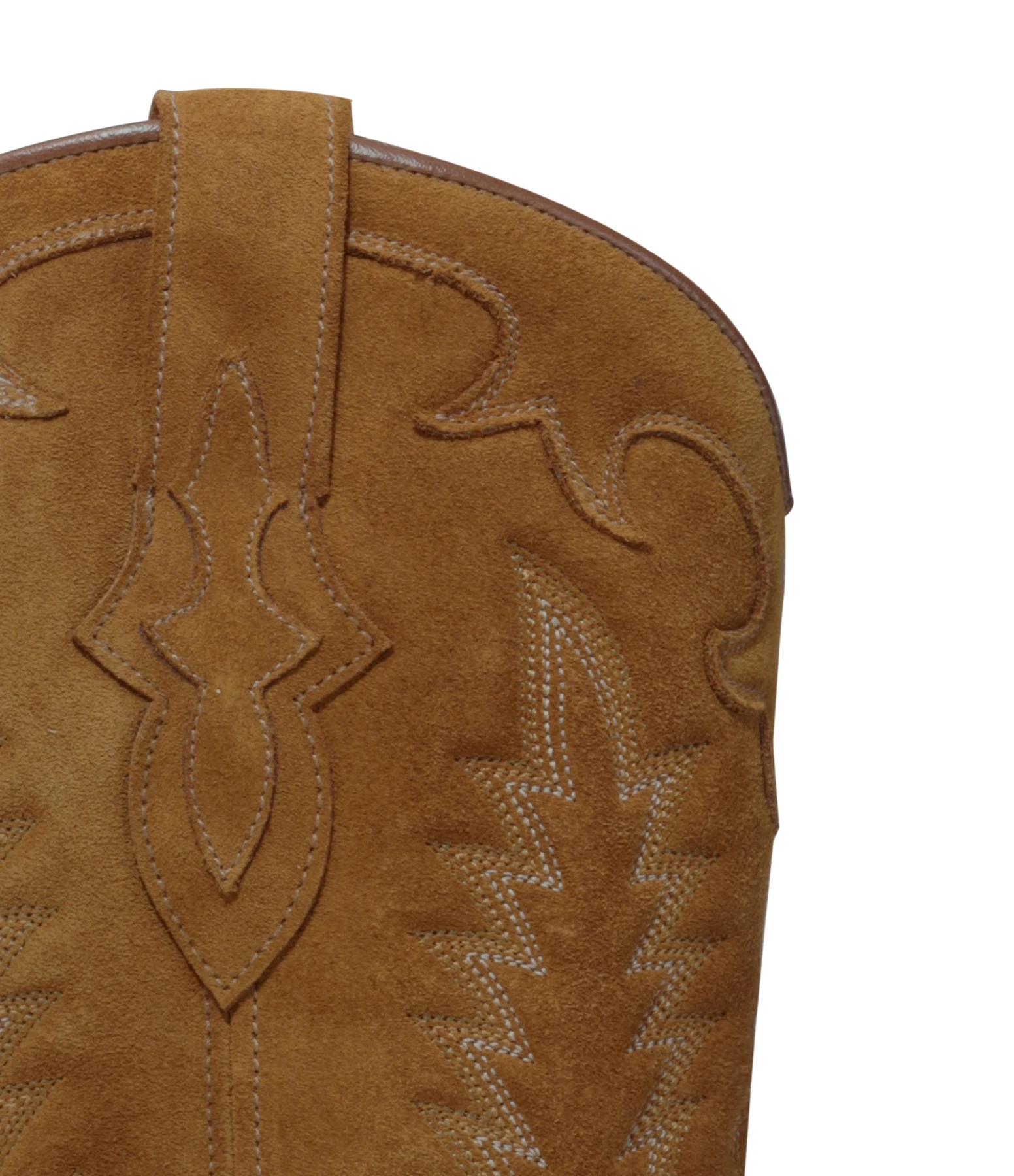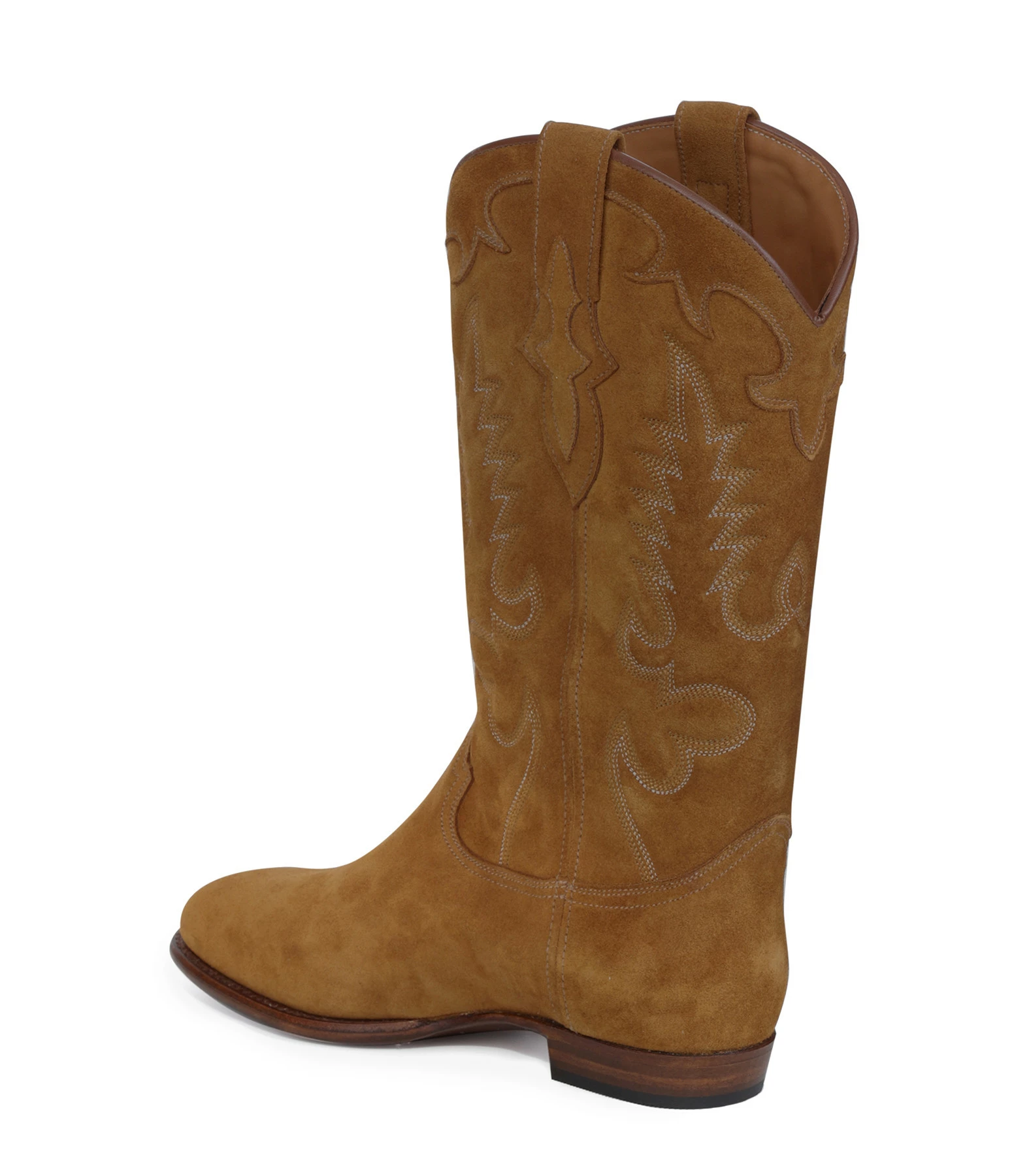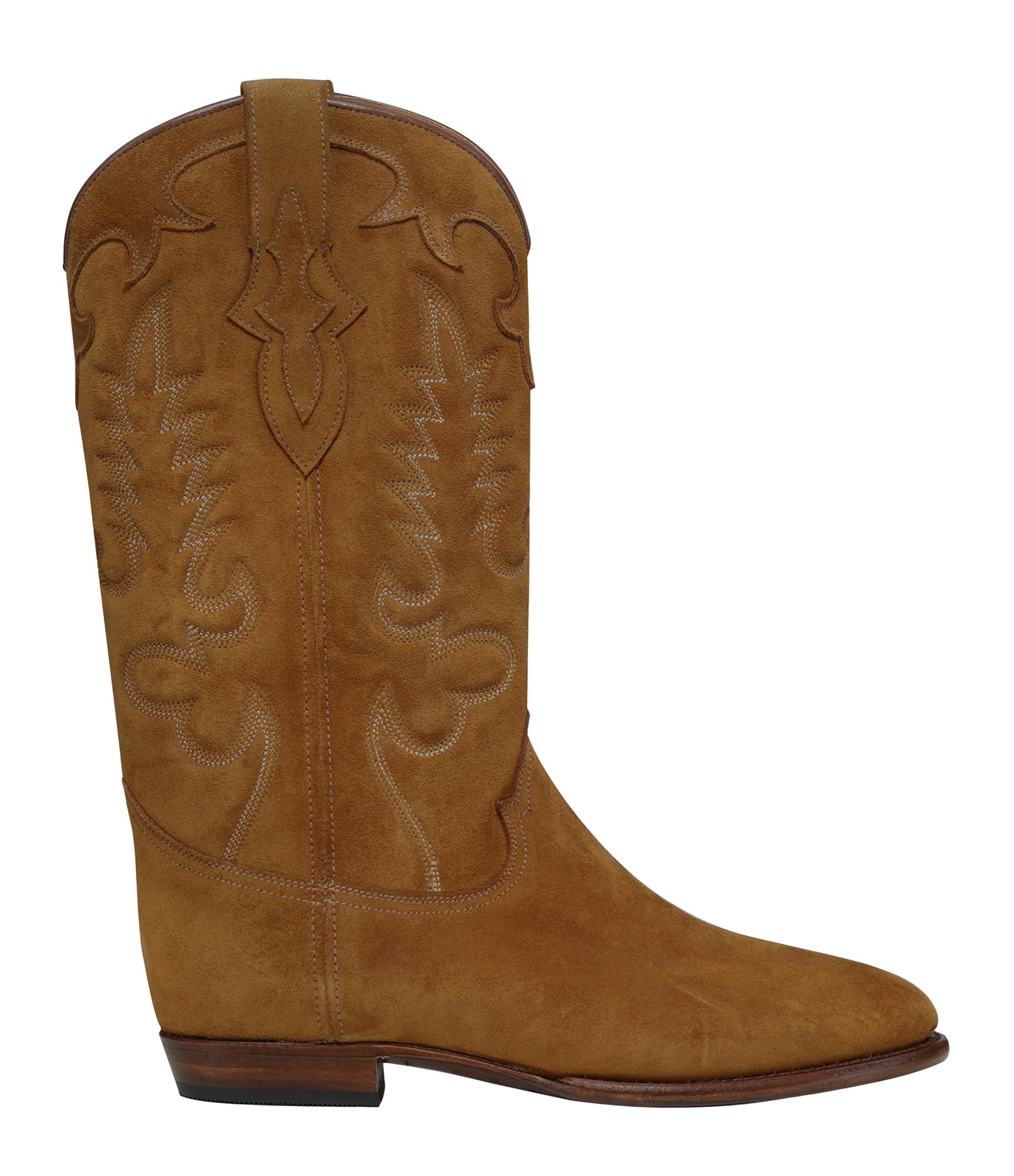Bottes plates en daim marron, style western. Bout arrondi souple. Tige brodée à la main (couture goodyear). Talon légèrement biseauté.