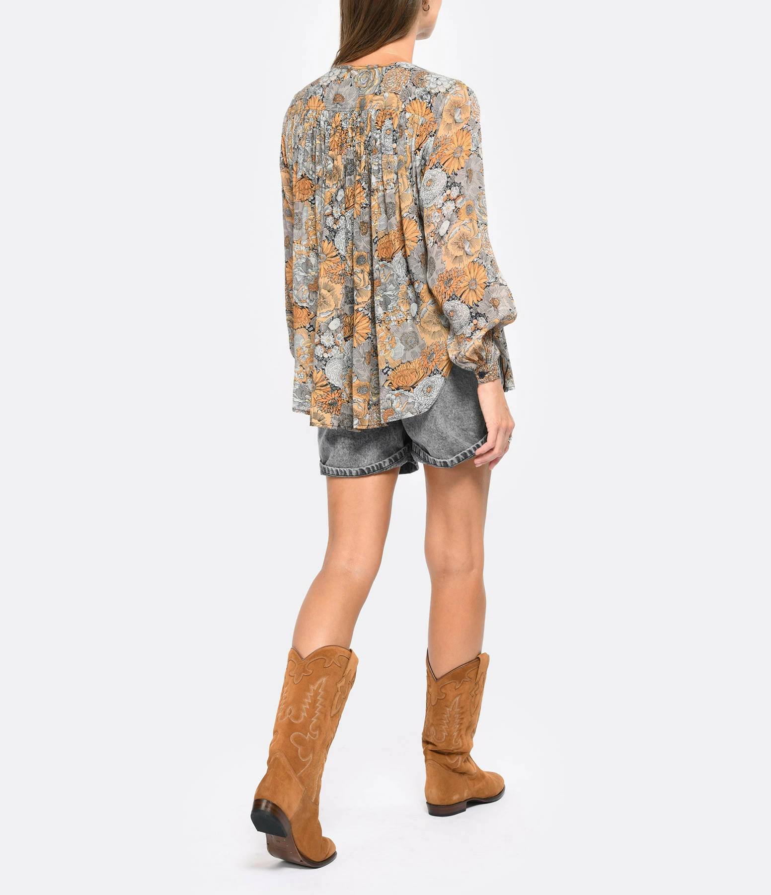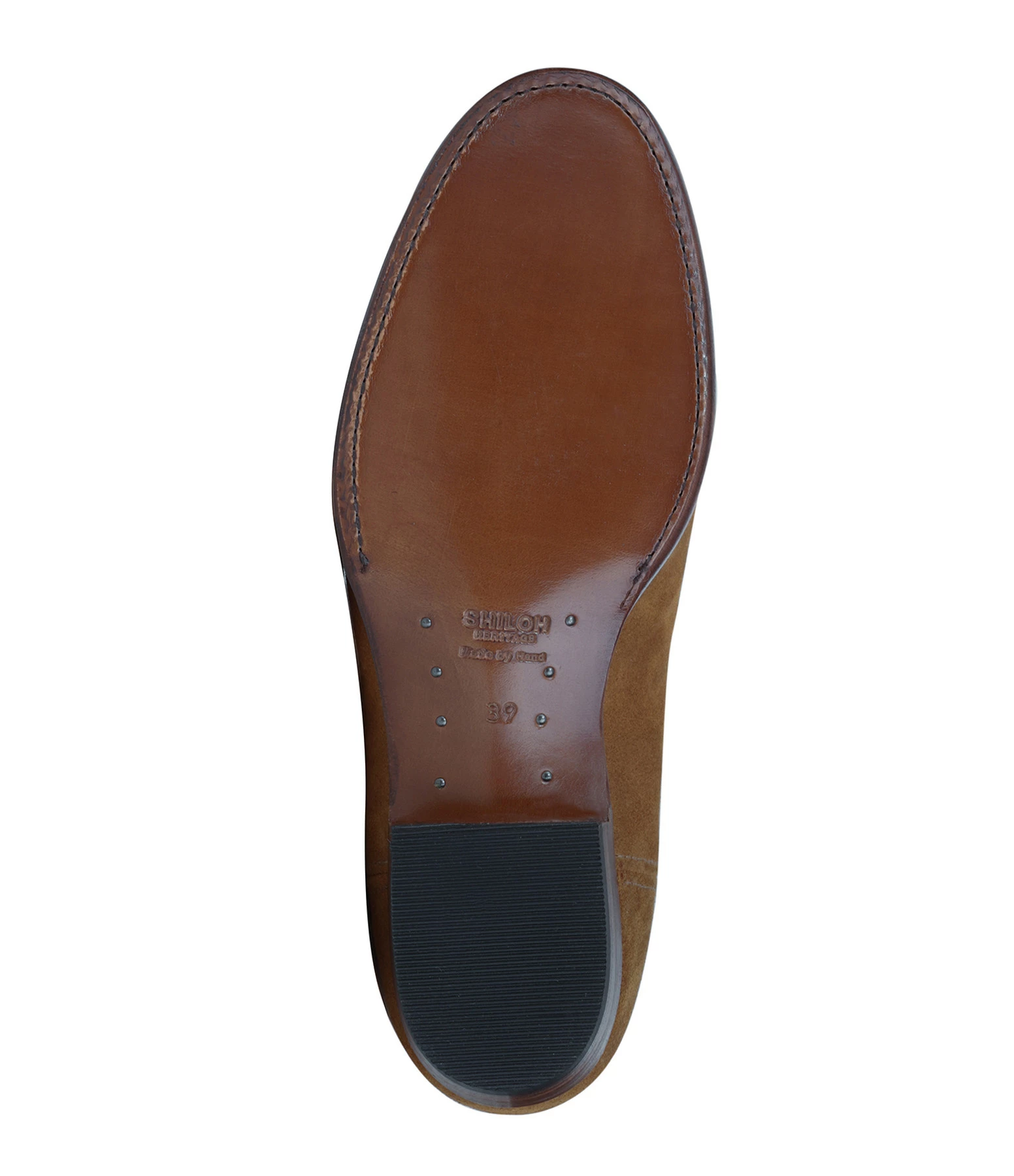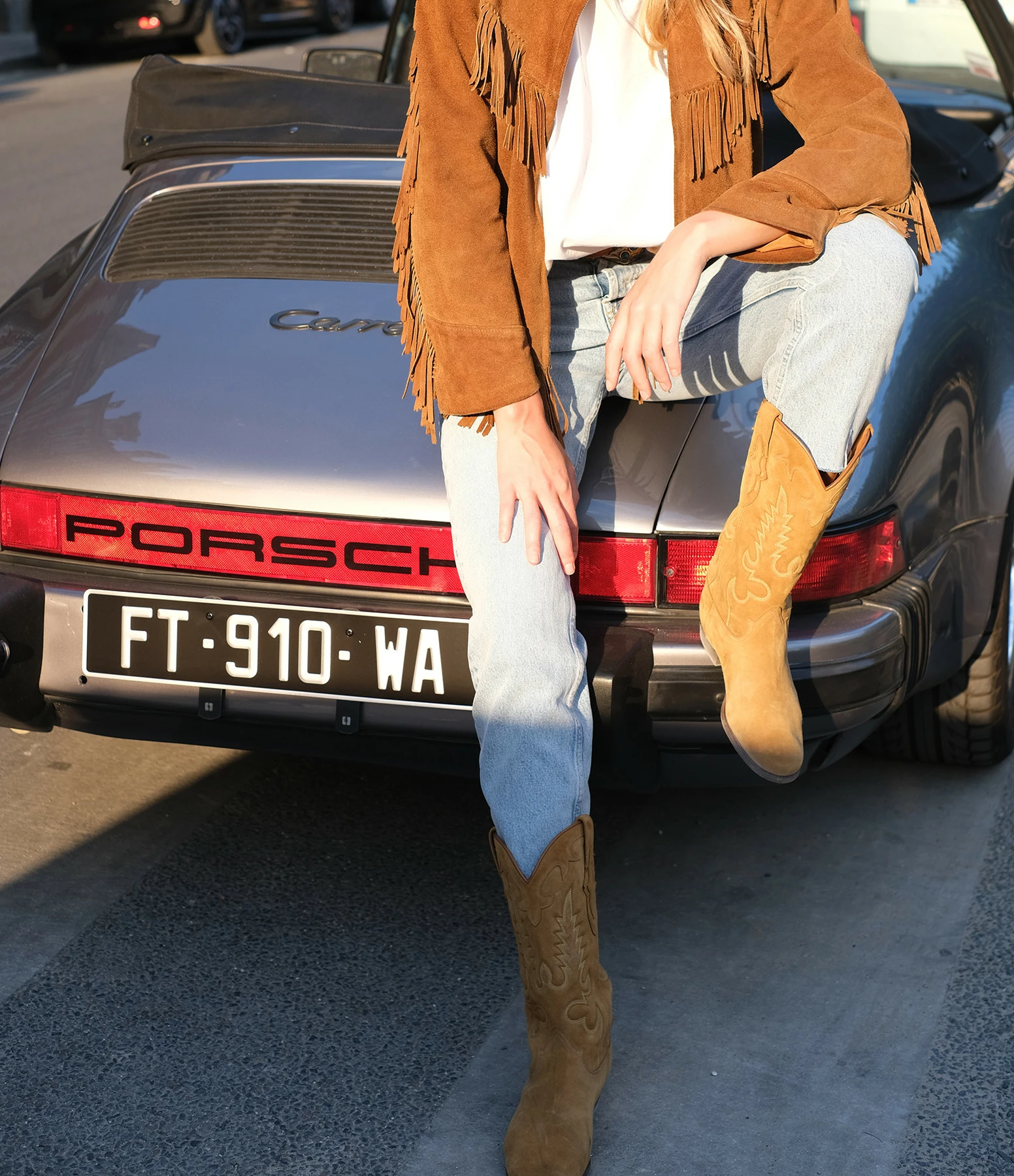 Bottes plates en daim marron, style western. Bout arrondi souple. Tige brodée à la main (couture goodyear). Talon légèrement biseauté.