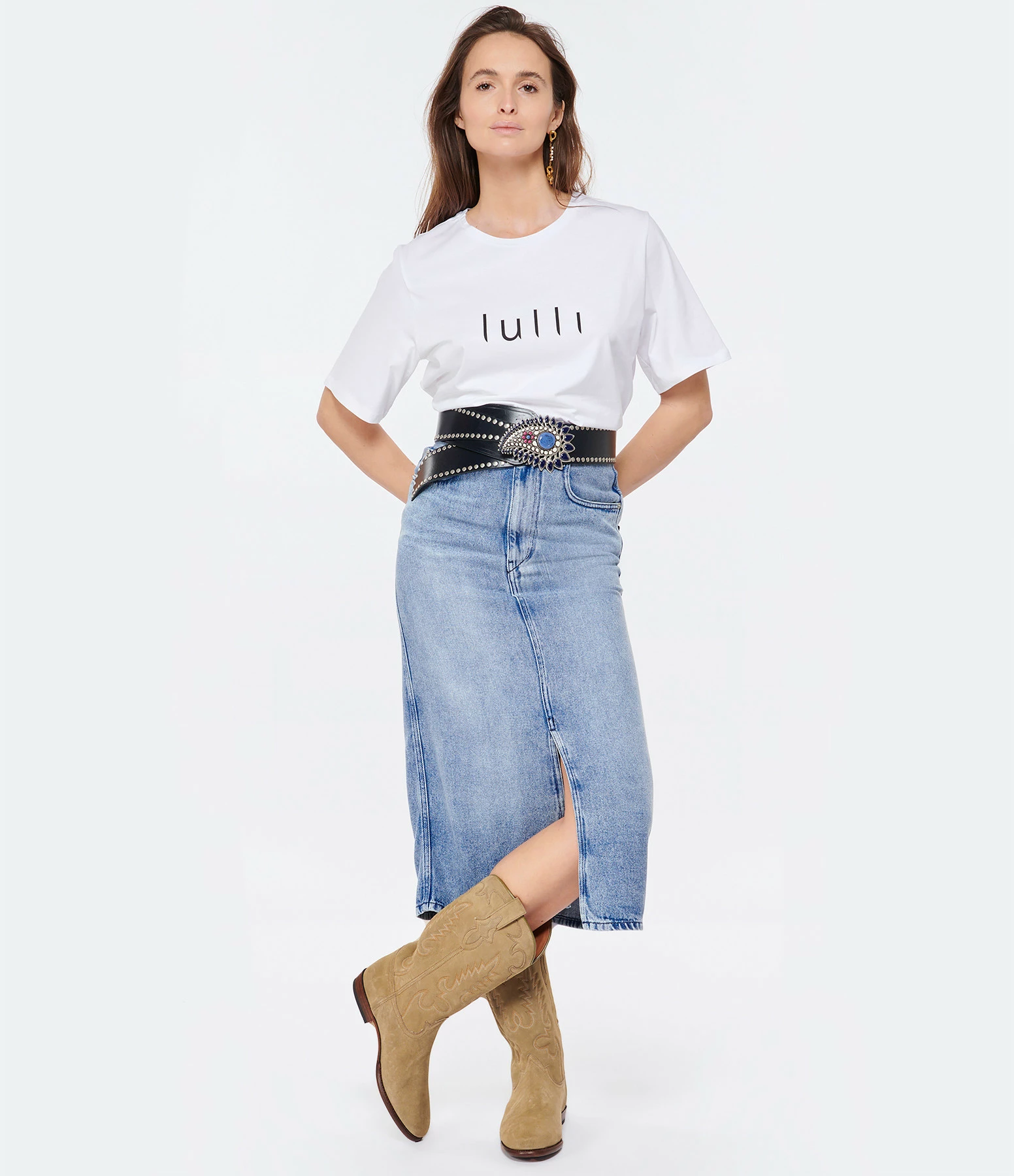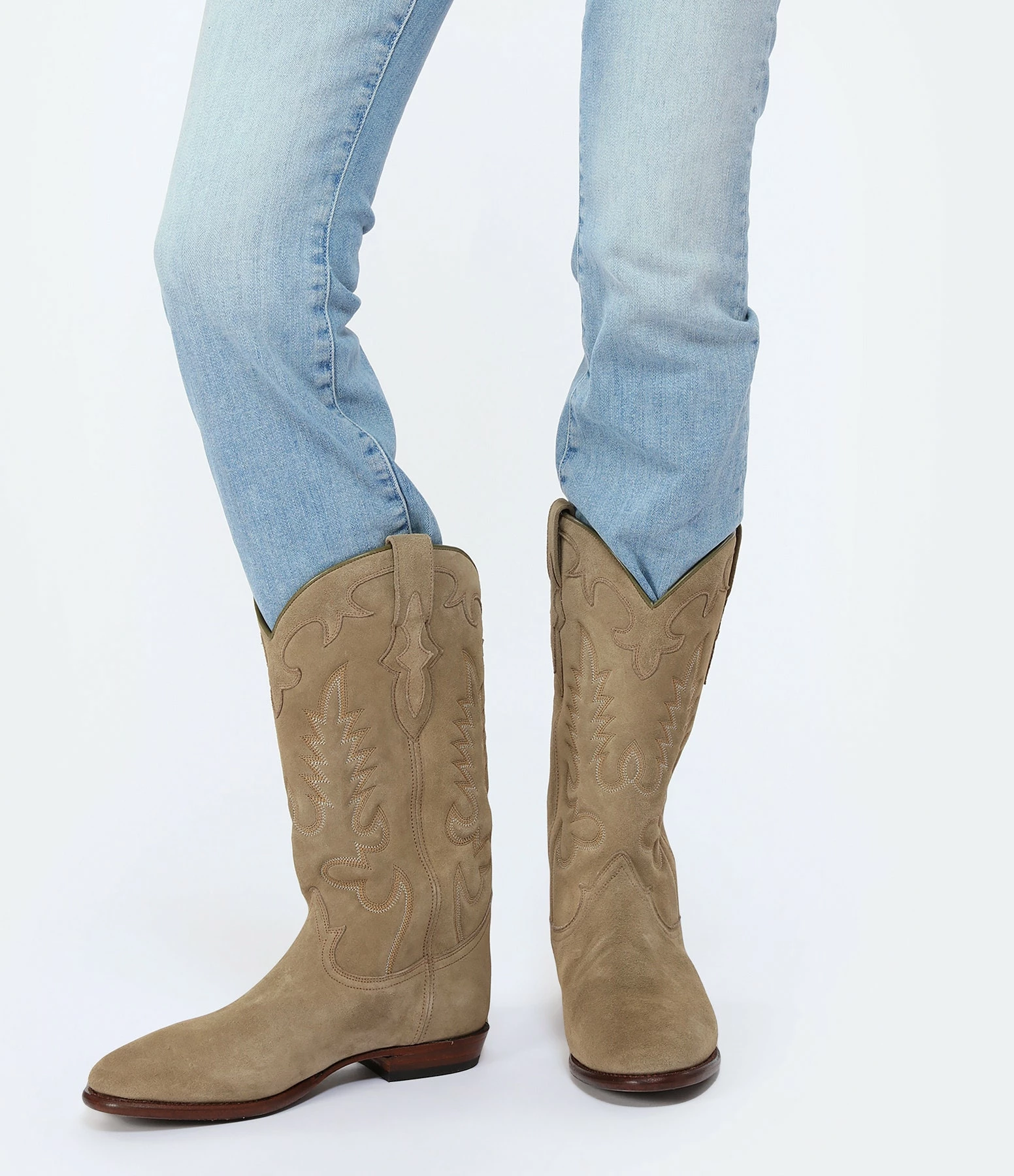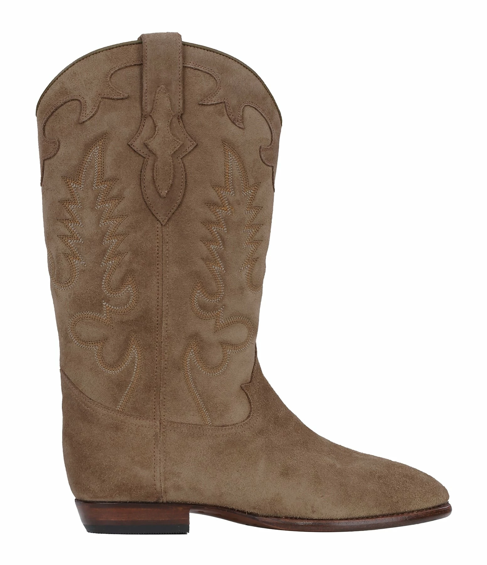 Bottes plates en daim beige, style western. Bout arrondi souple. Tige brodée à la main (couture goodyear). Talon légèrement biseauté.