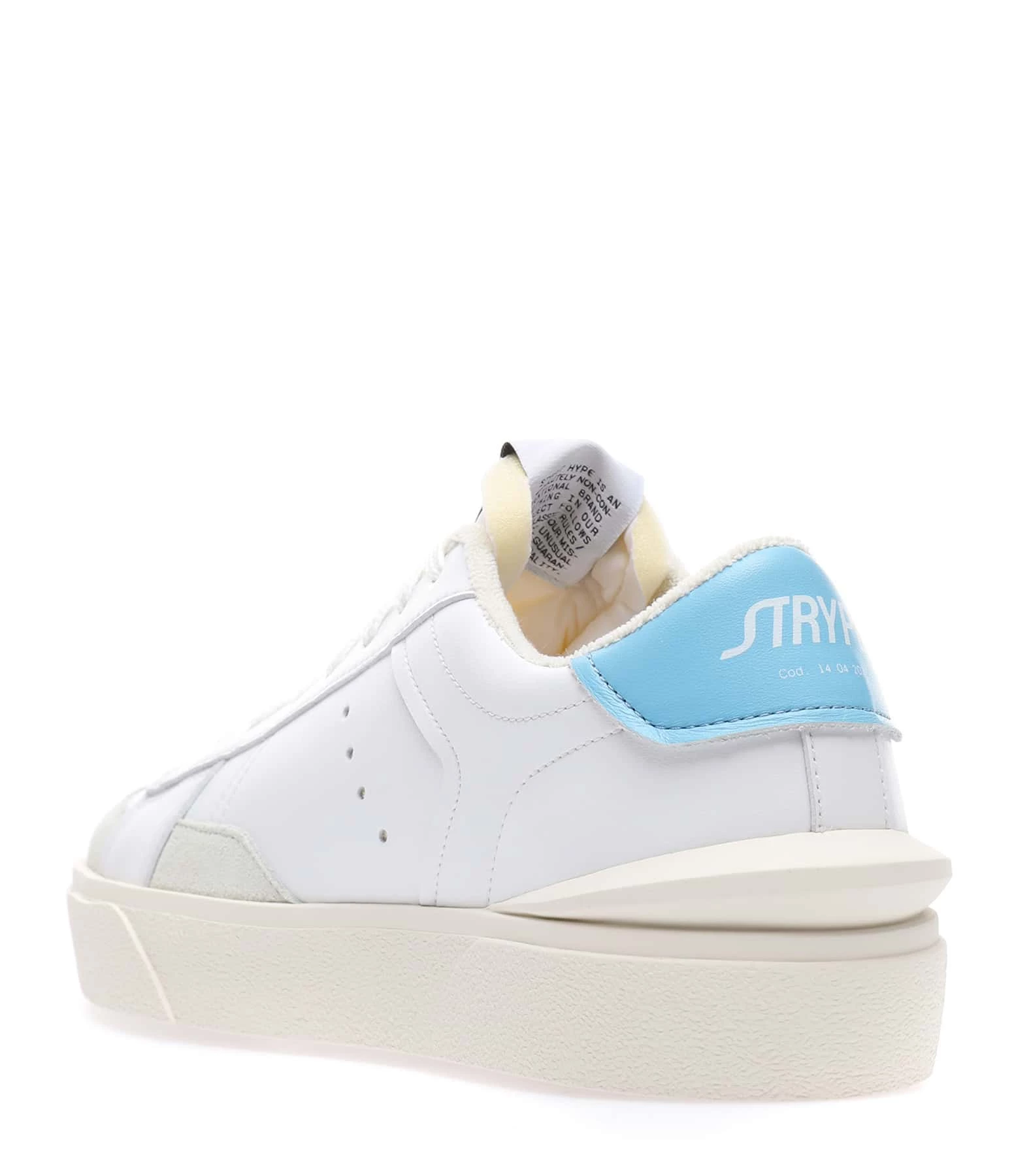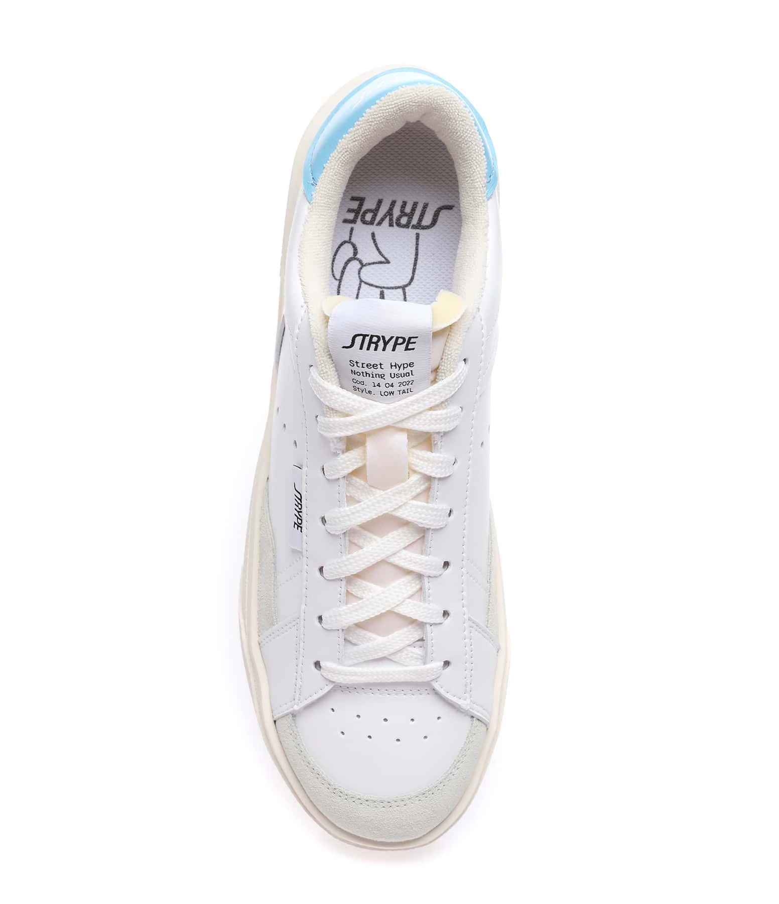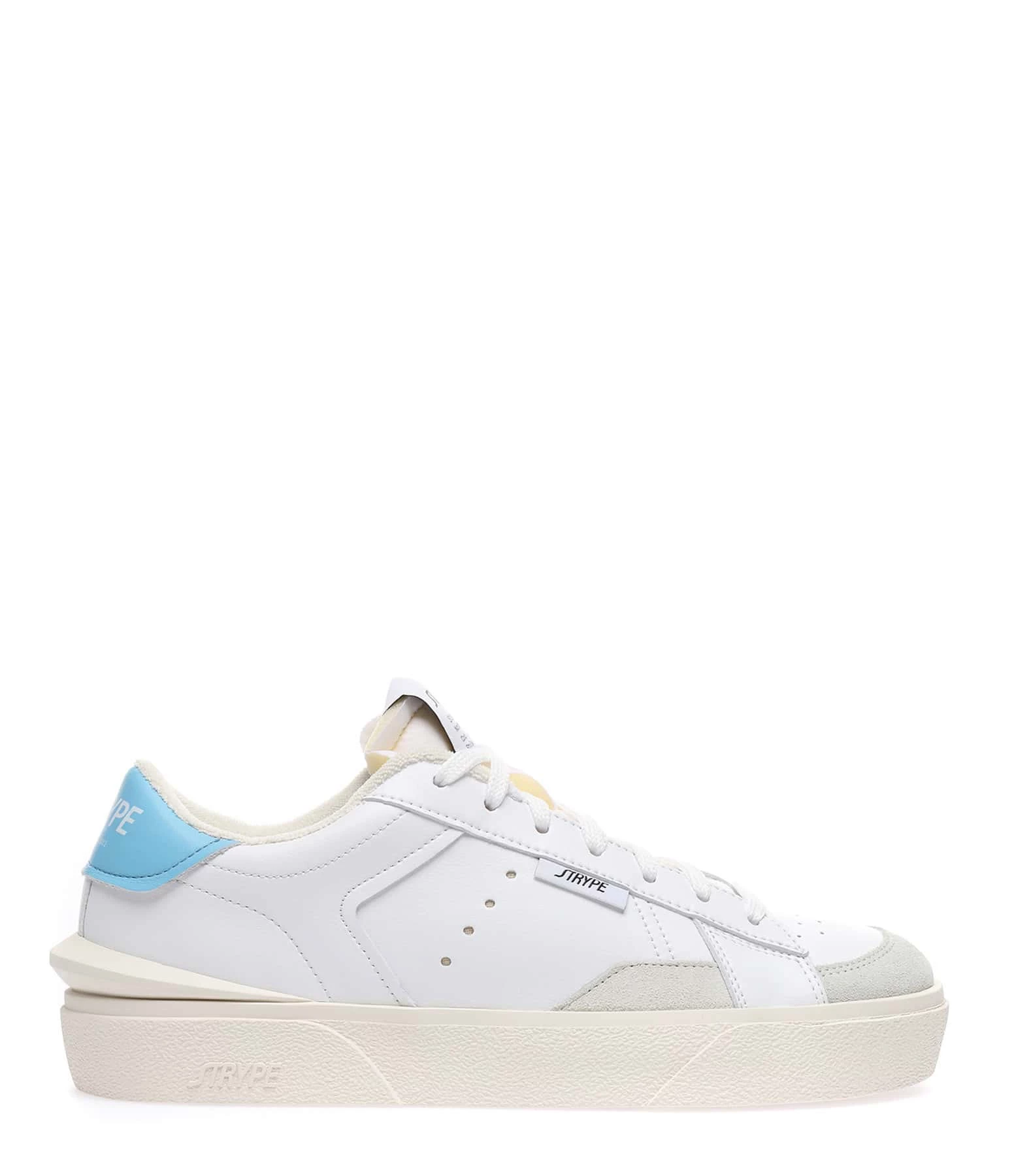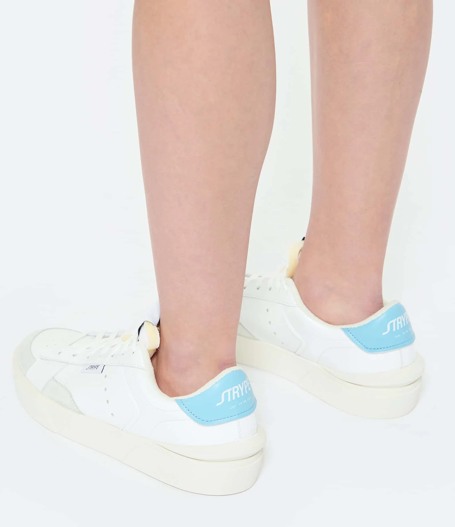 Baskets basses en cuir lisse blanc avec empiècements en cuir suédé gris clair. Renfort talon en cuir bleu clair. Lacets blancs. Logo brodé sur le côté extérieur.