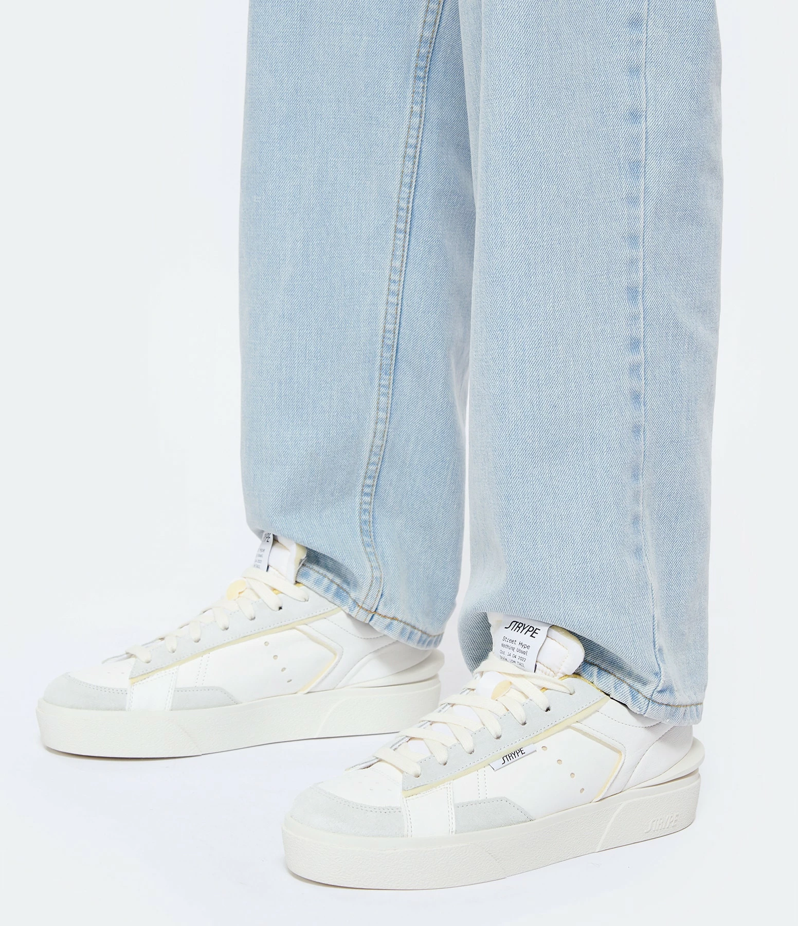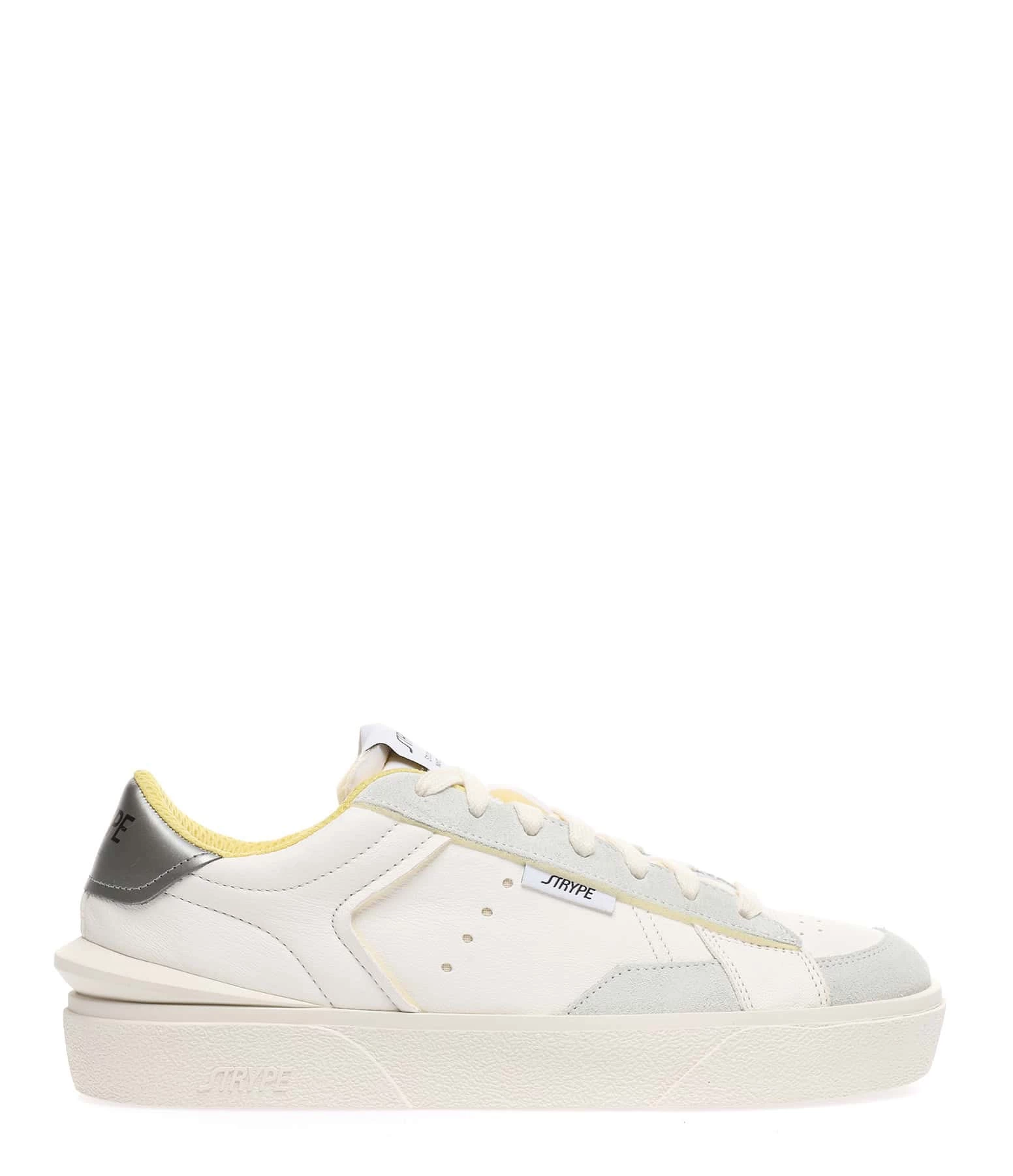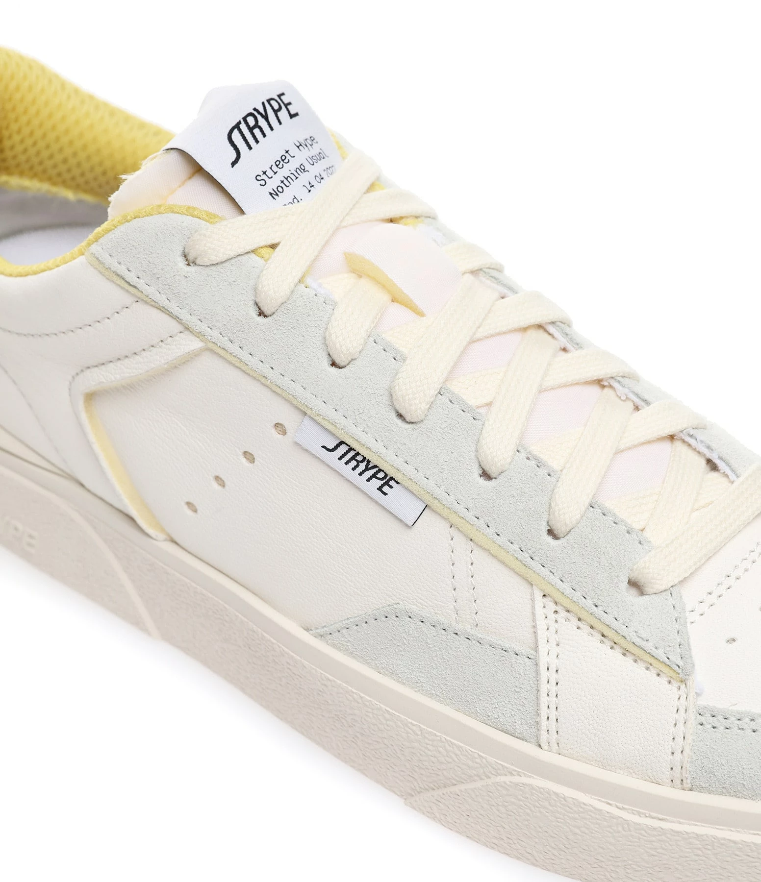 Baskets basses en cuir biologique lisse blanc avec empiècements en cuir suédé gris clair. Renfort talon en cuir argenté. Lacets blancs. Logo brodé sur le côté extérieur.
