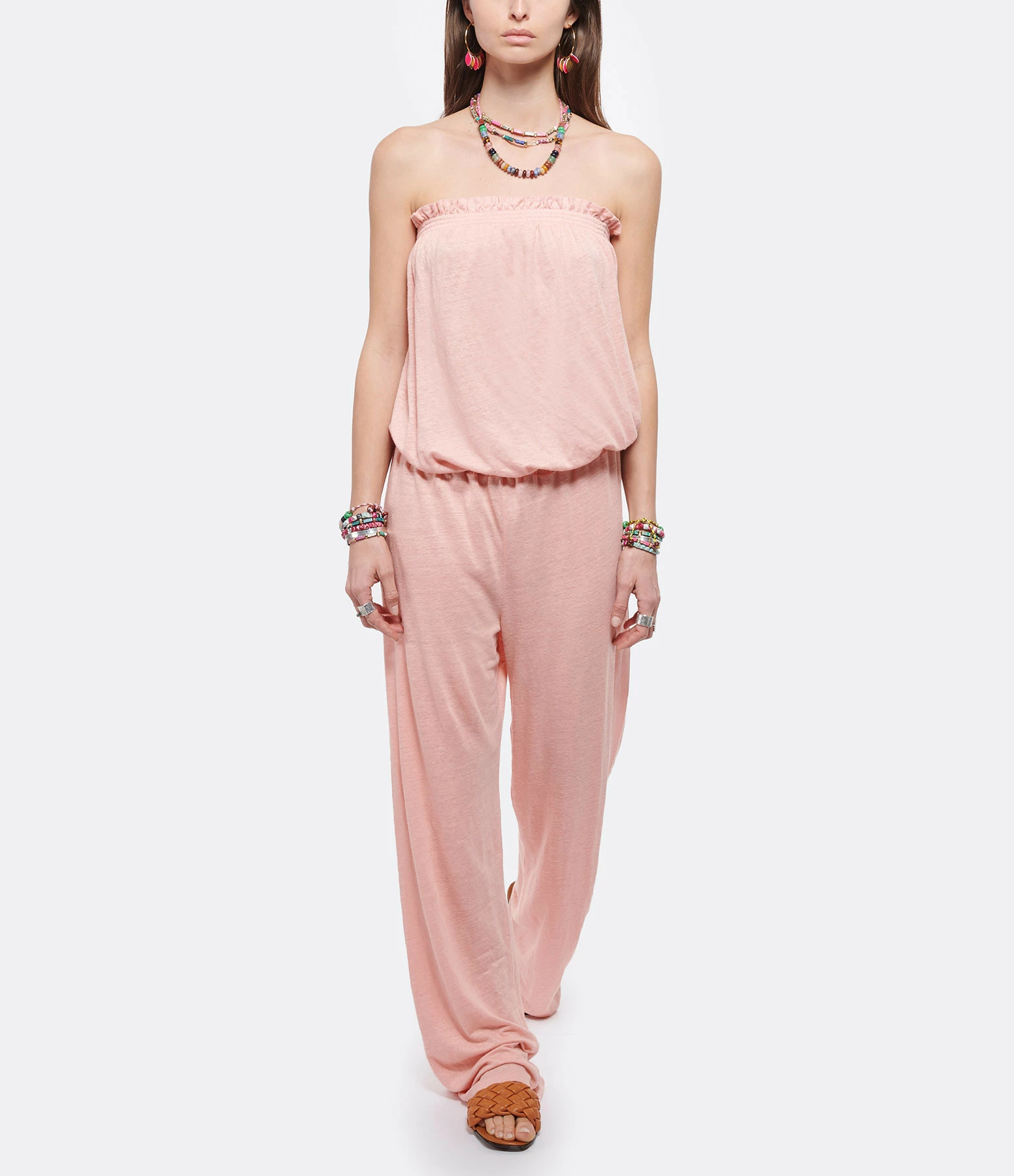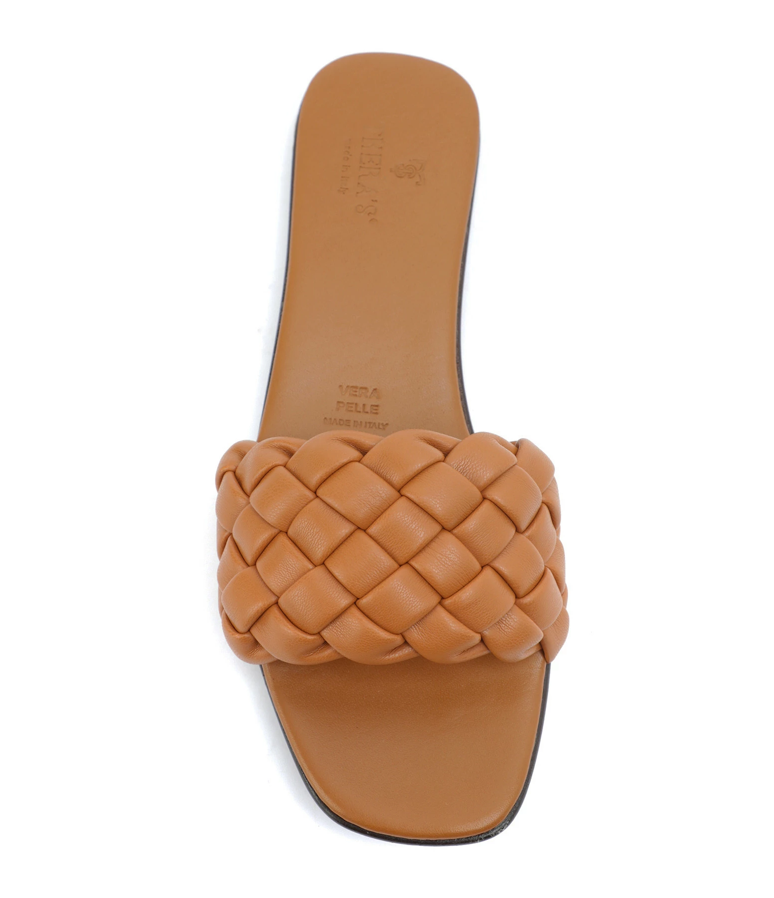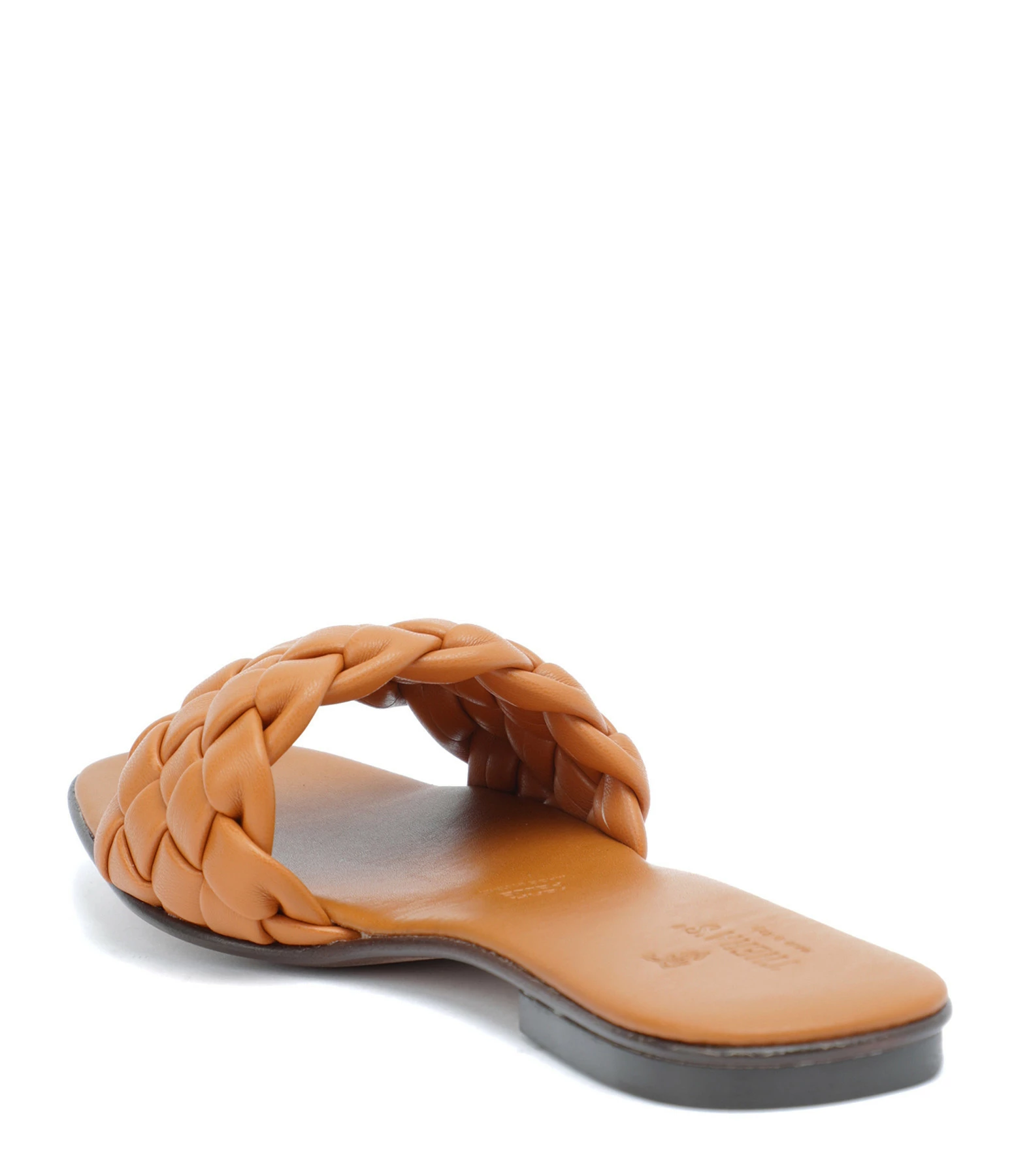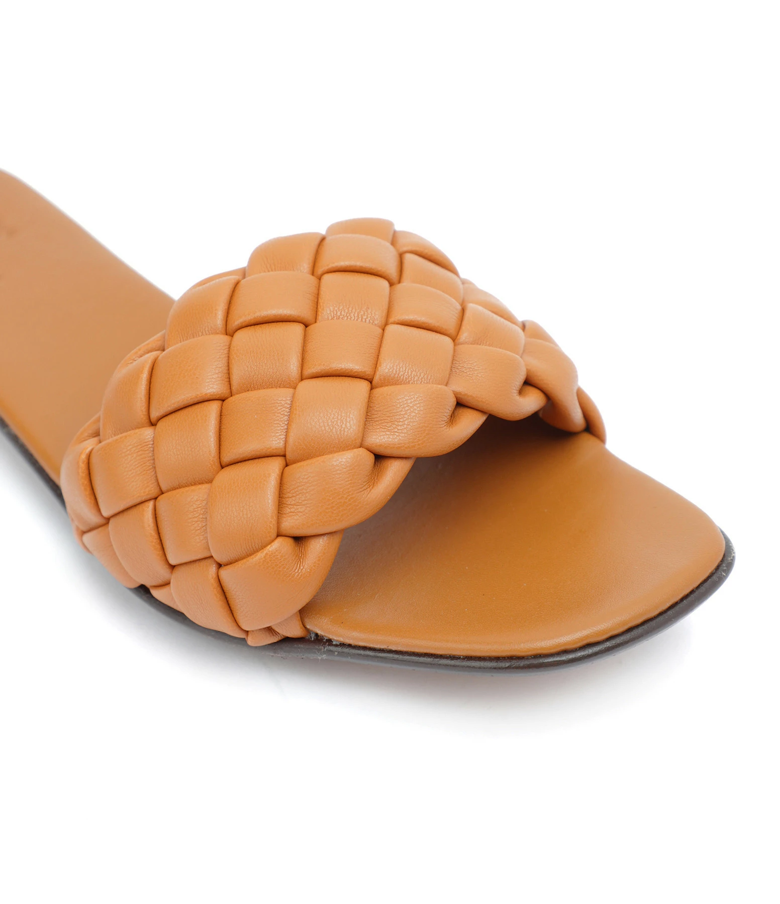 Sandales plates en cuir camel. Large bande tressée à l’avant.