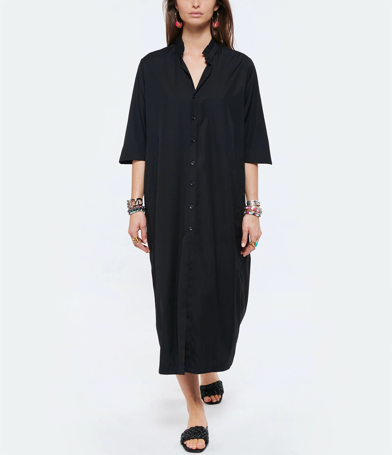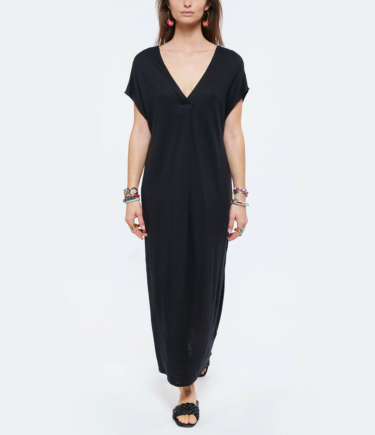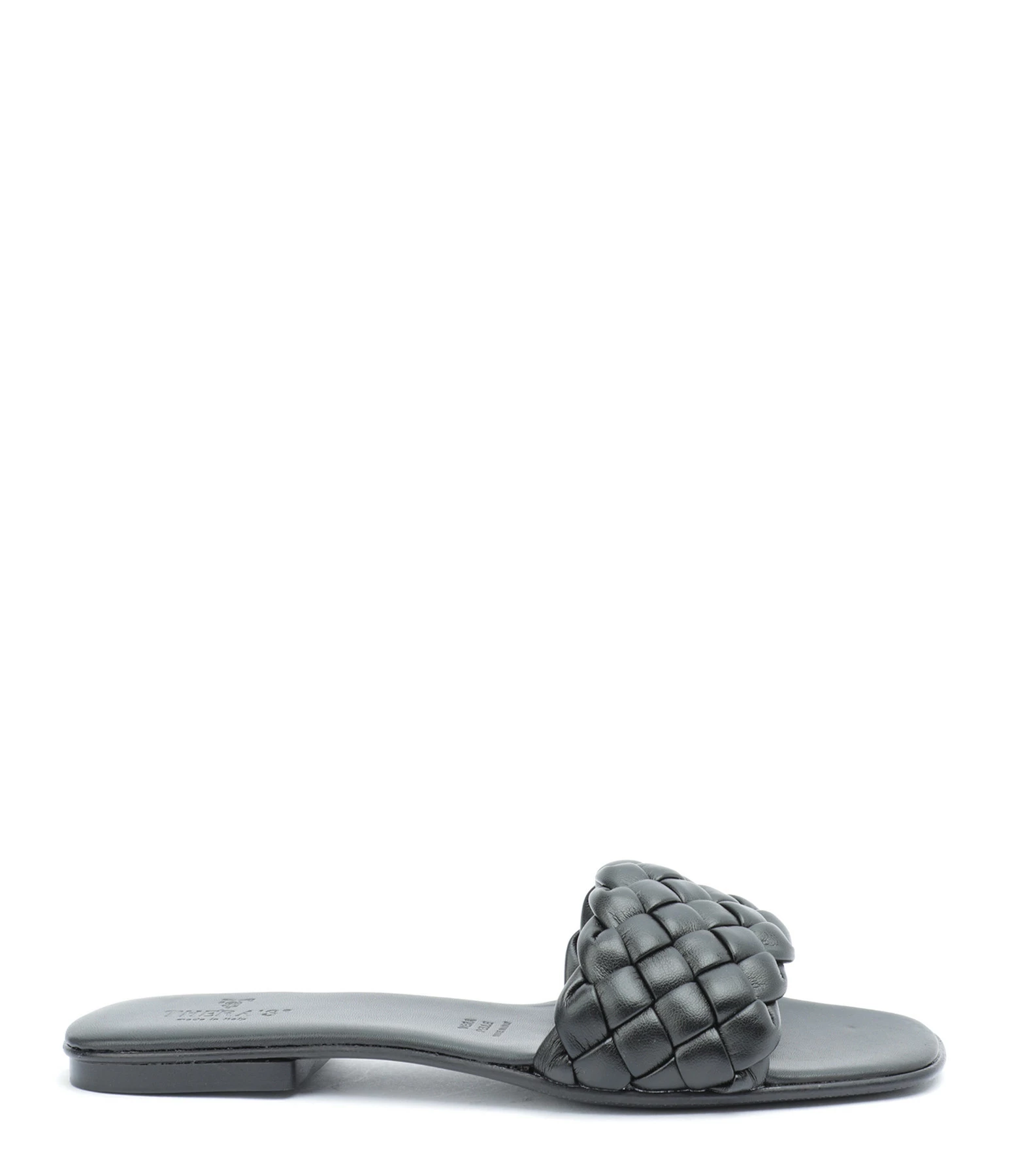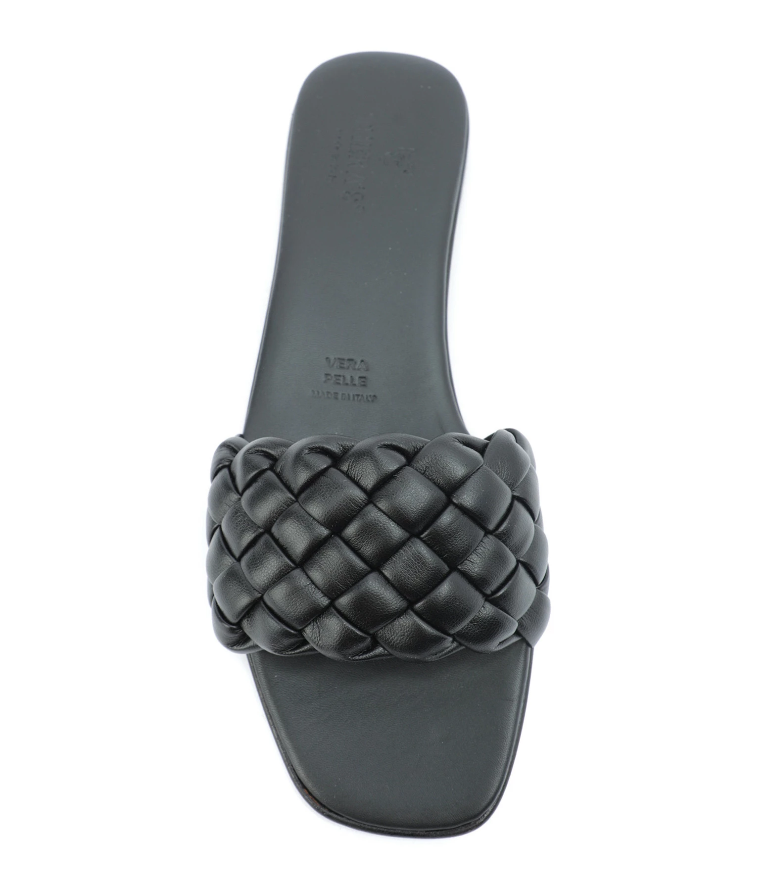 Sandales plates en cuir noir. Large bande tressée à l’avant.
