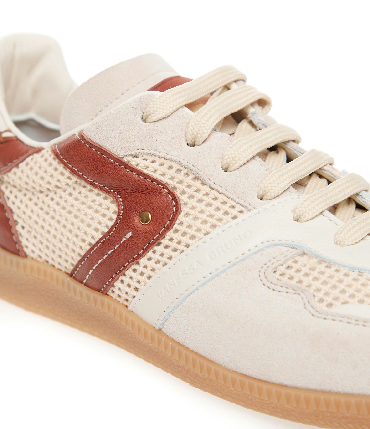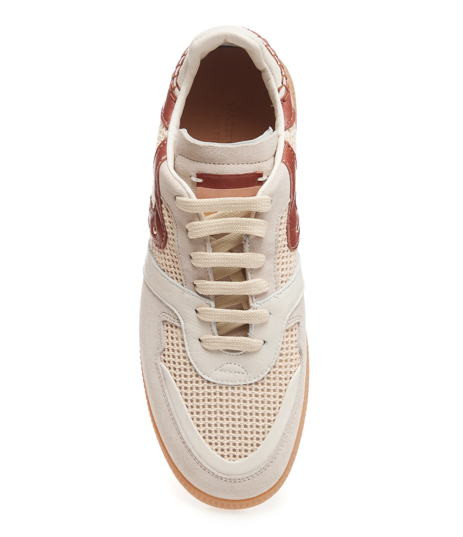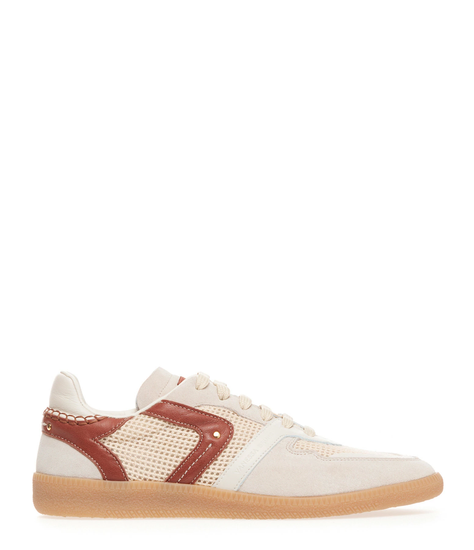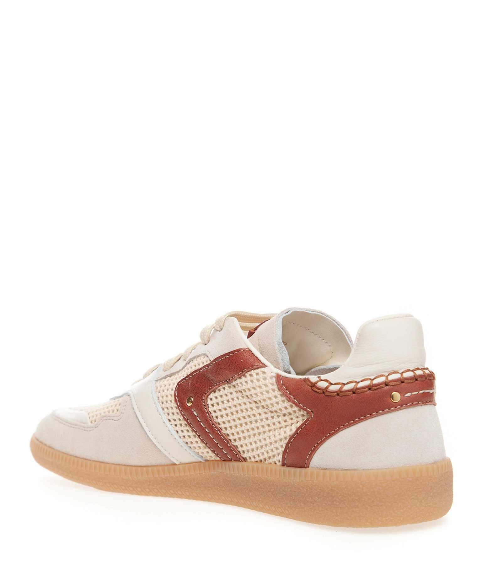 Baskets basses en cuir écru. Inserts latéraux en cuir marron. Lacets écrus.