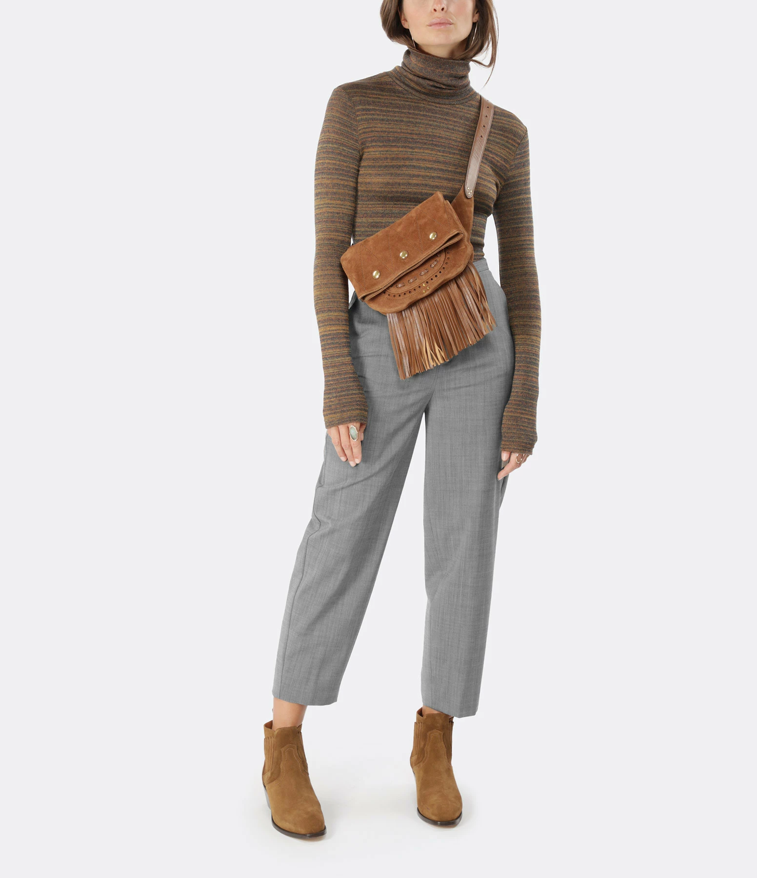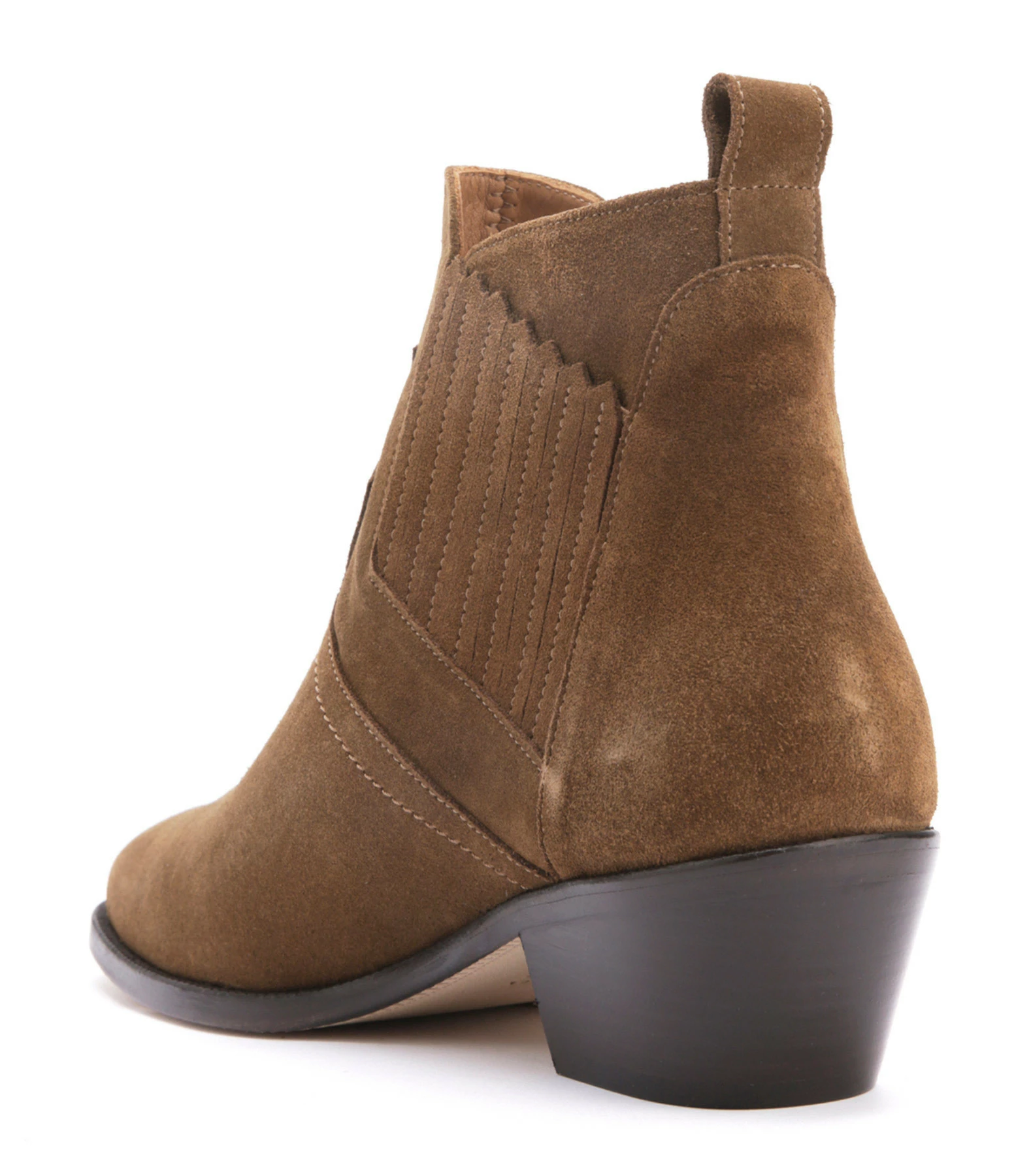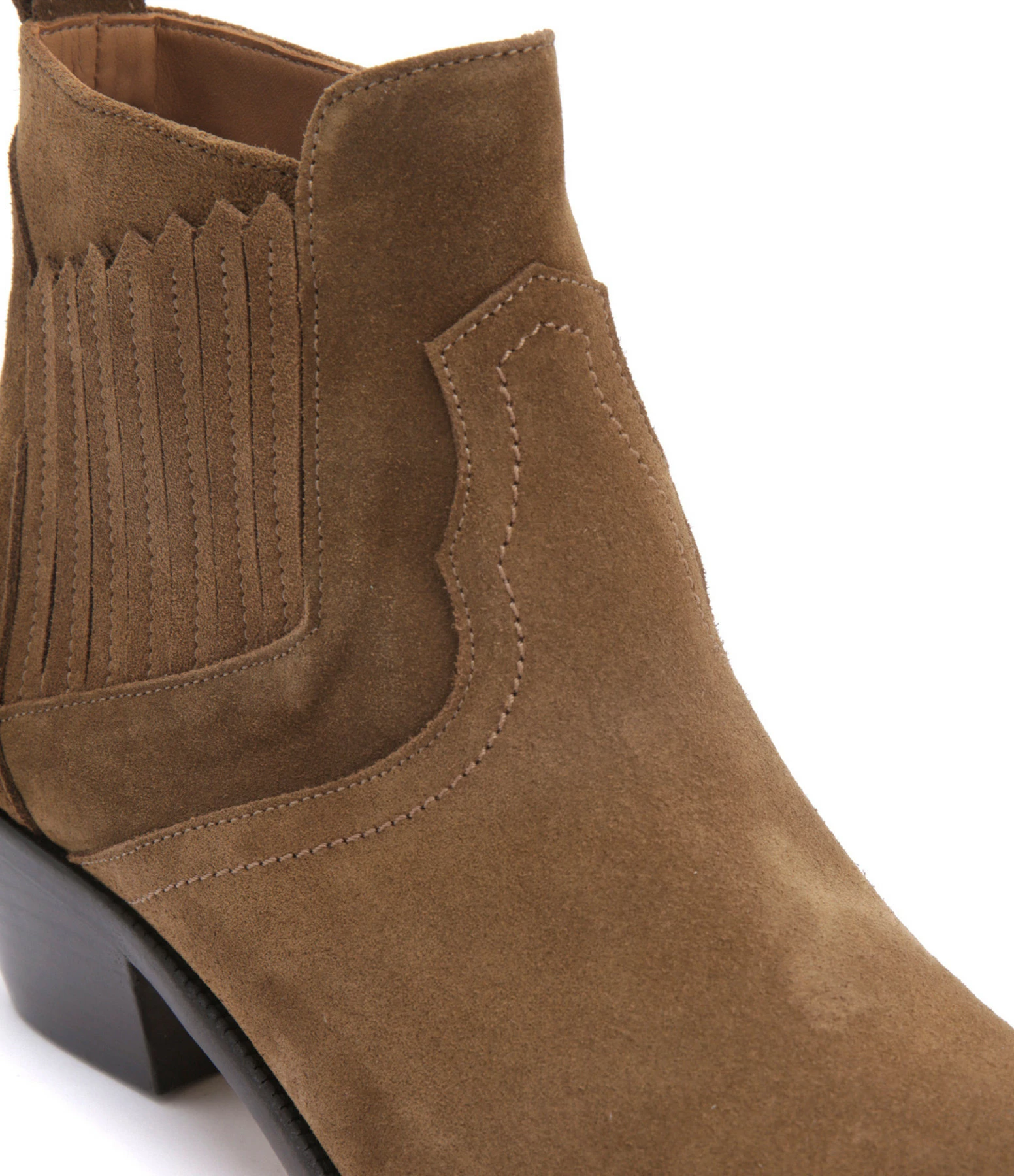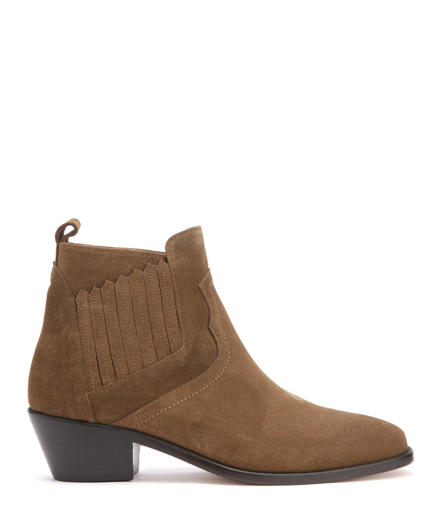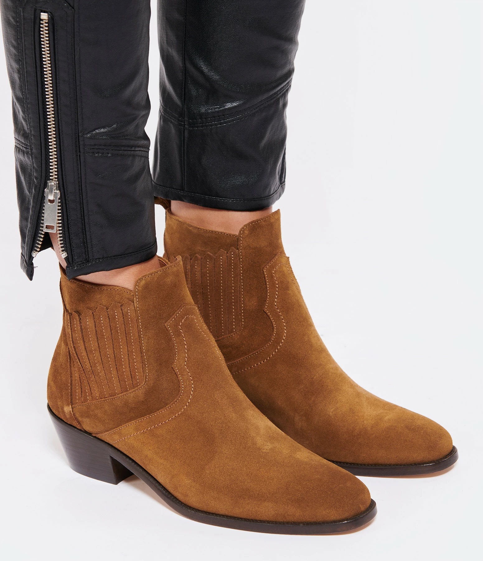 Bottines santiag basses à petits talons en cuir suédé marron. Bout pointu. Empiècements élastiques sur les côtés et languette arrière facilitant l’enfilage. Intérieur doublé en cuir lisse.
