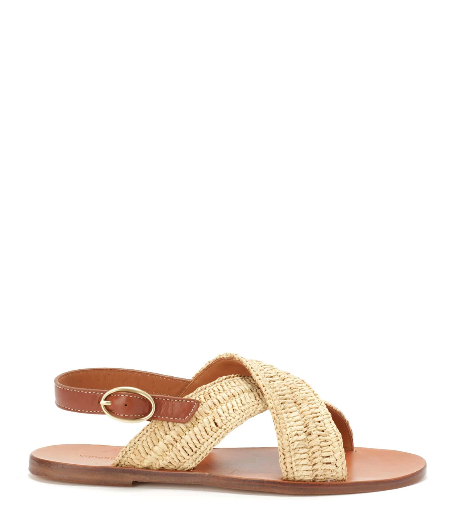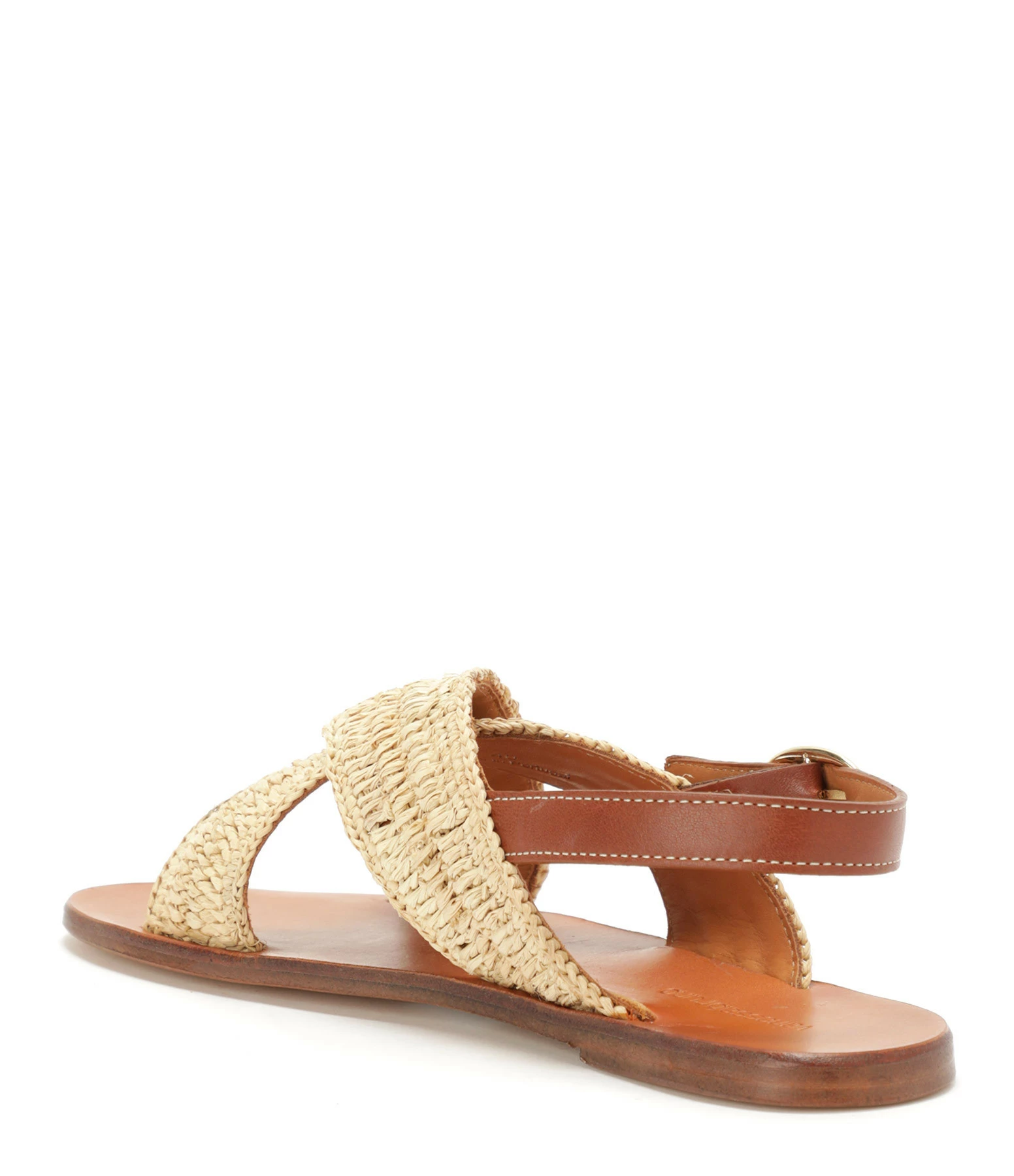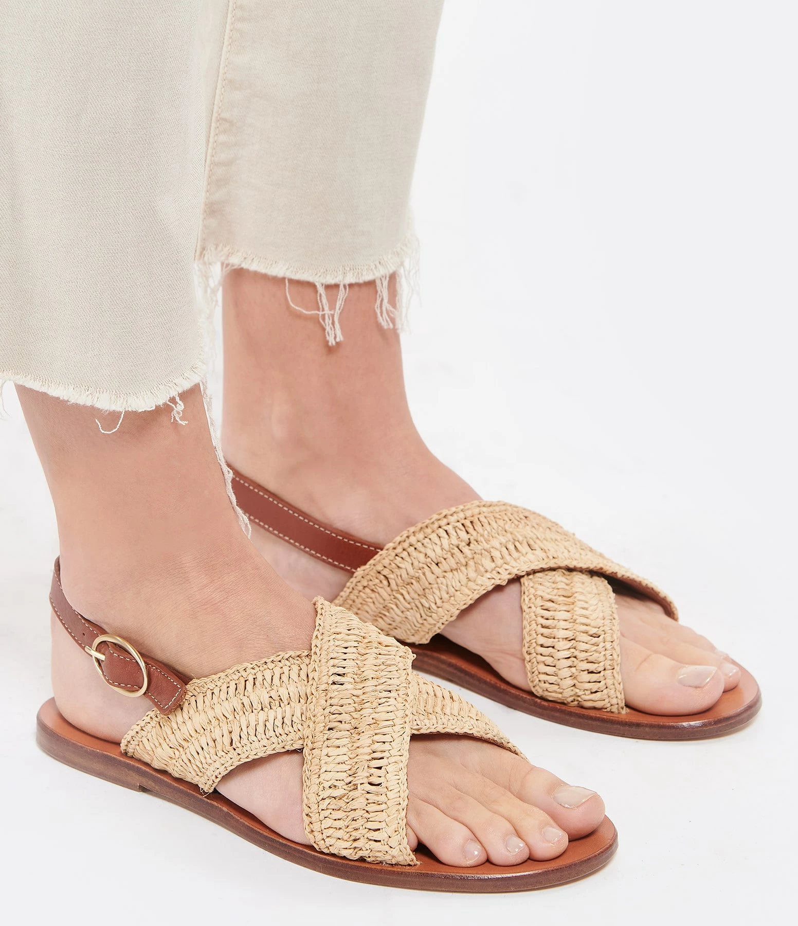Sandales plates en raphia. Bride réglable autour de la cheville Boucle dorée sur la bride.