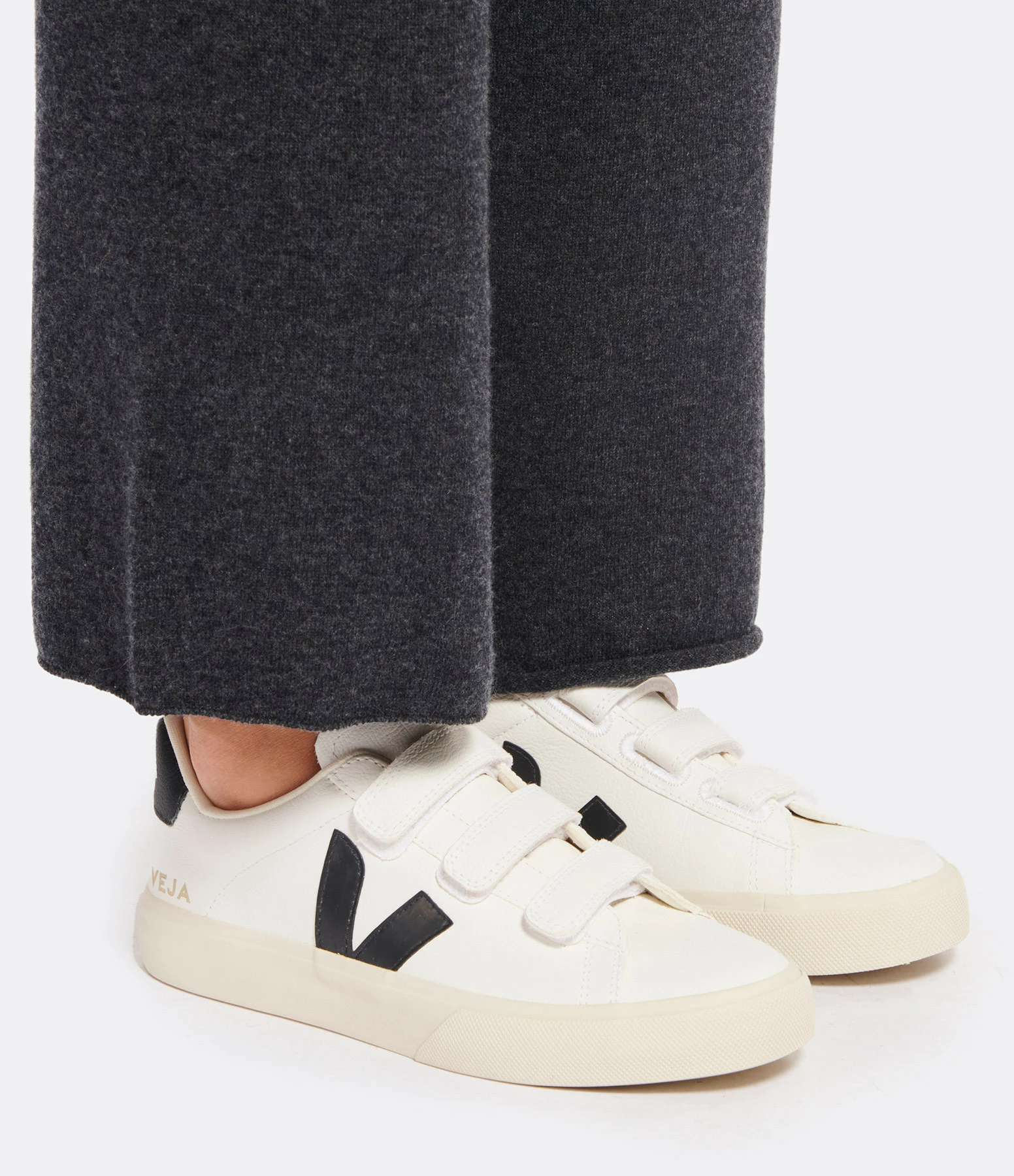 Baskets à scratch en cuir lisse blanc. Logo latéral “V” en caoutchouc noir. Renfort talon en cuir noir. Semelle en caoutchouc sauvage d’Amazonie.