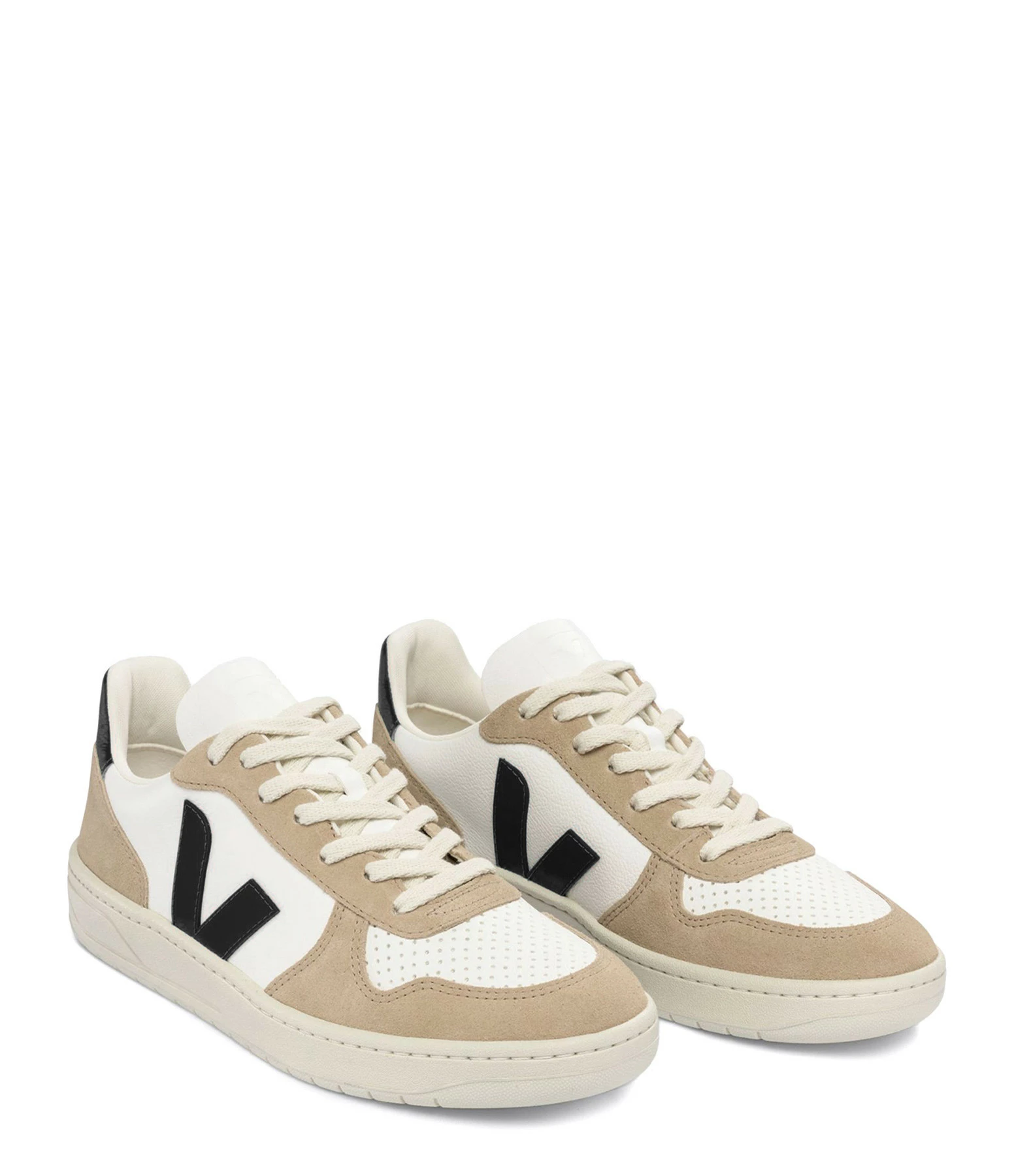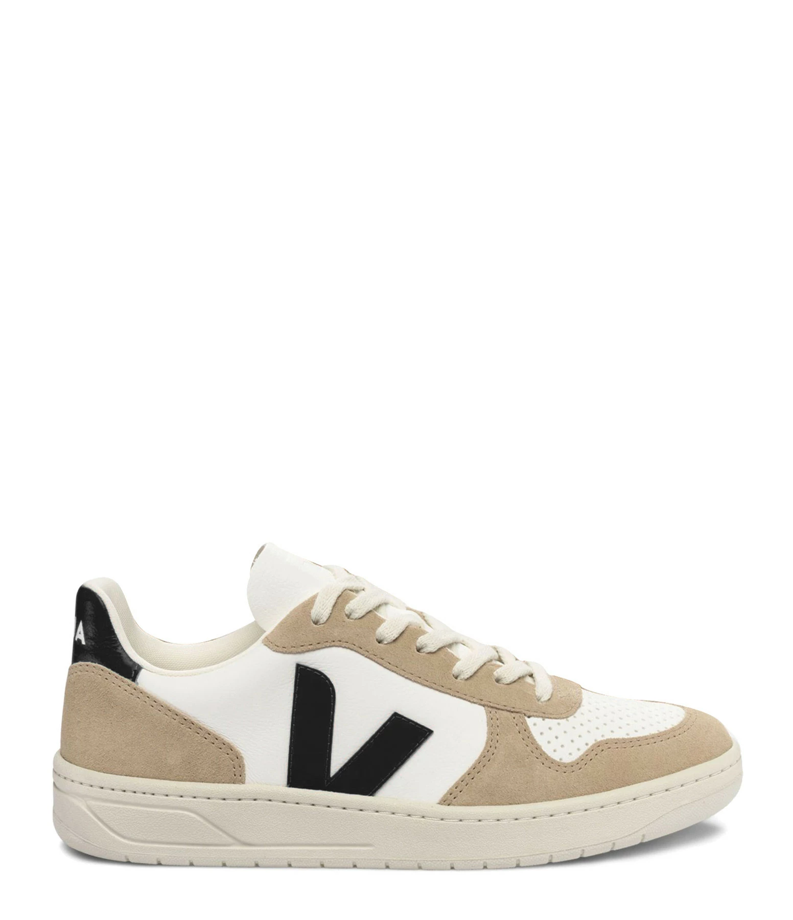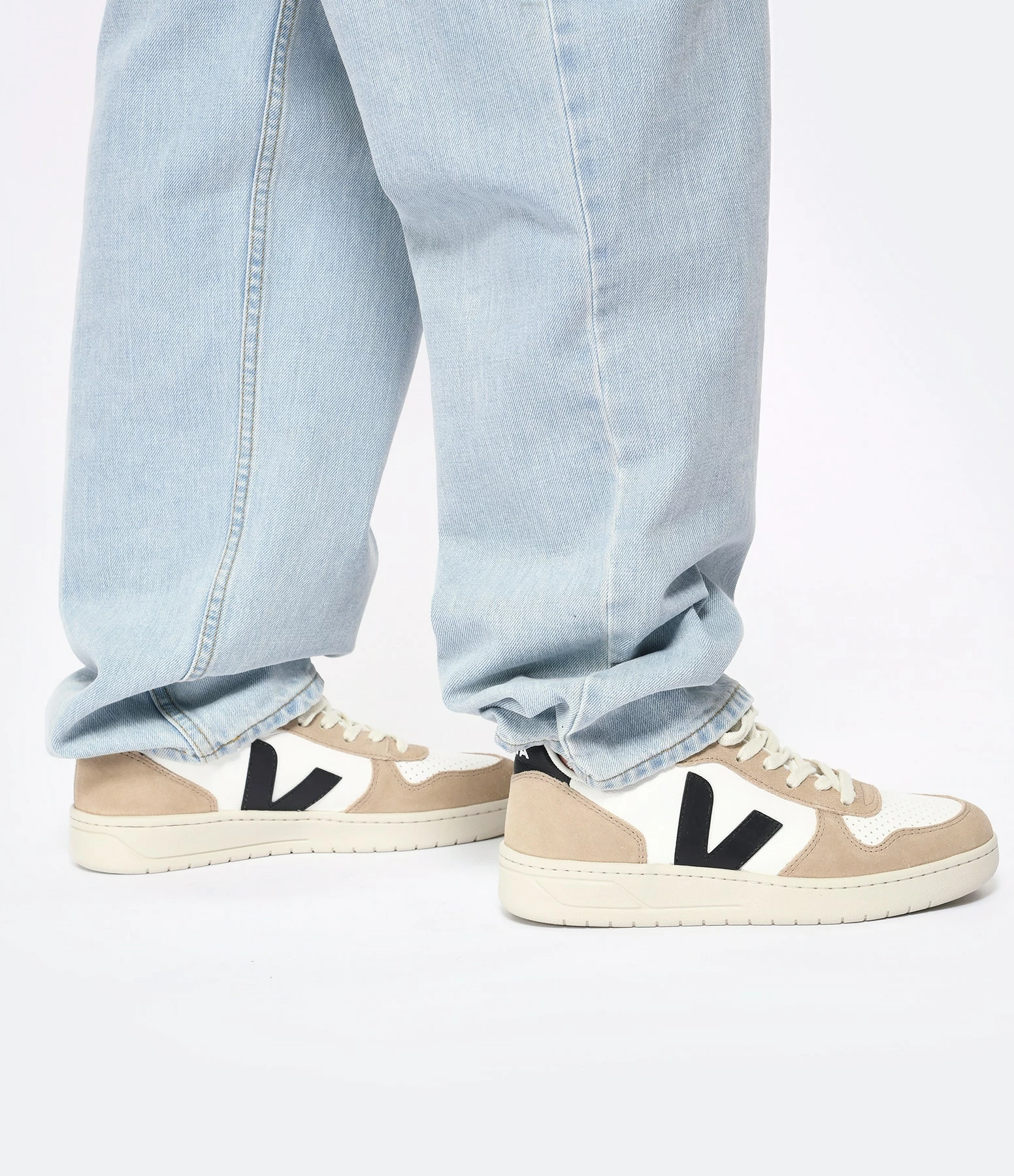 Baskets en cuir blanc et cuir suédé beige. Logo latéral “V” en caoutchouc naturel noir. Renfort talon en cuir lisse noir.