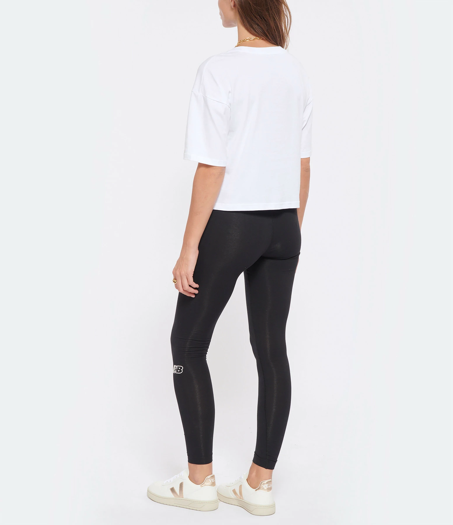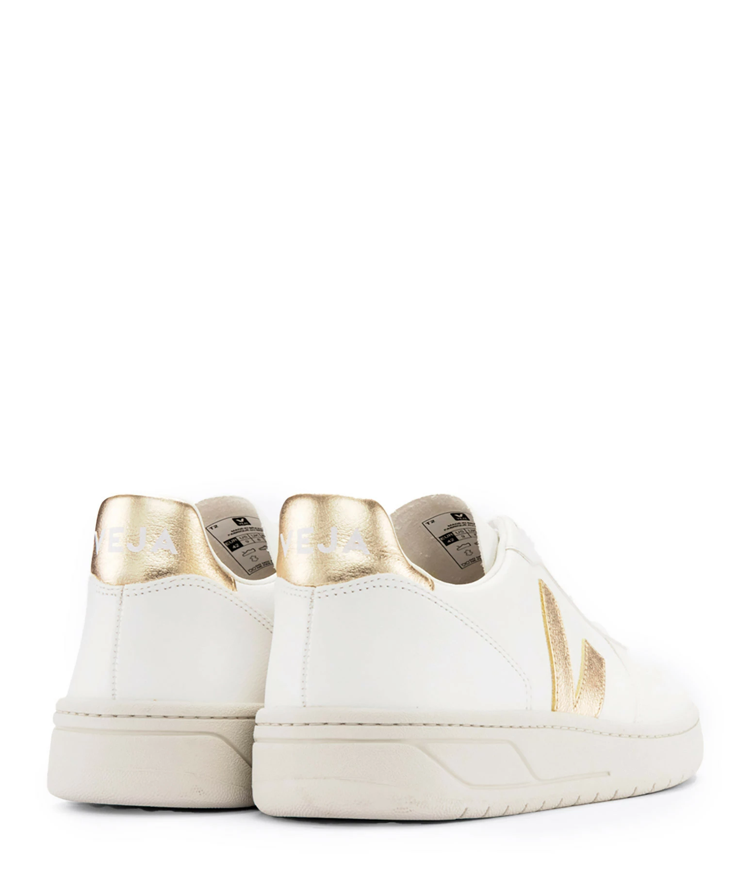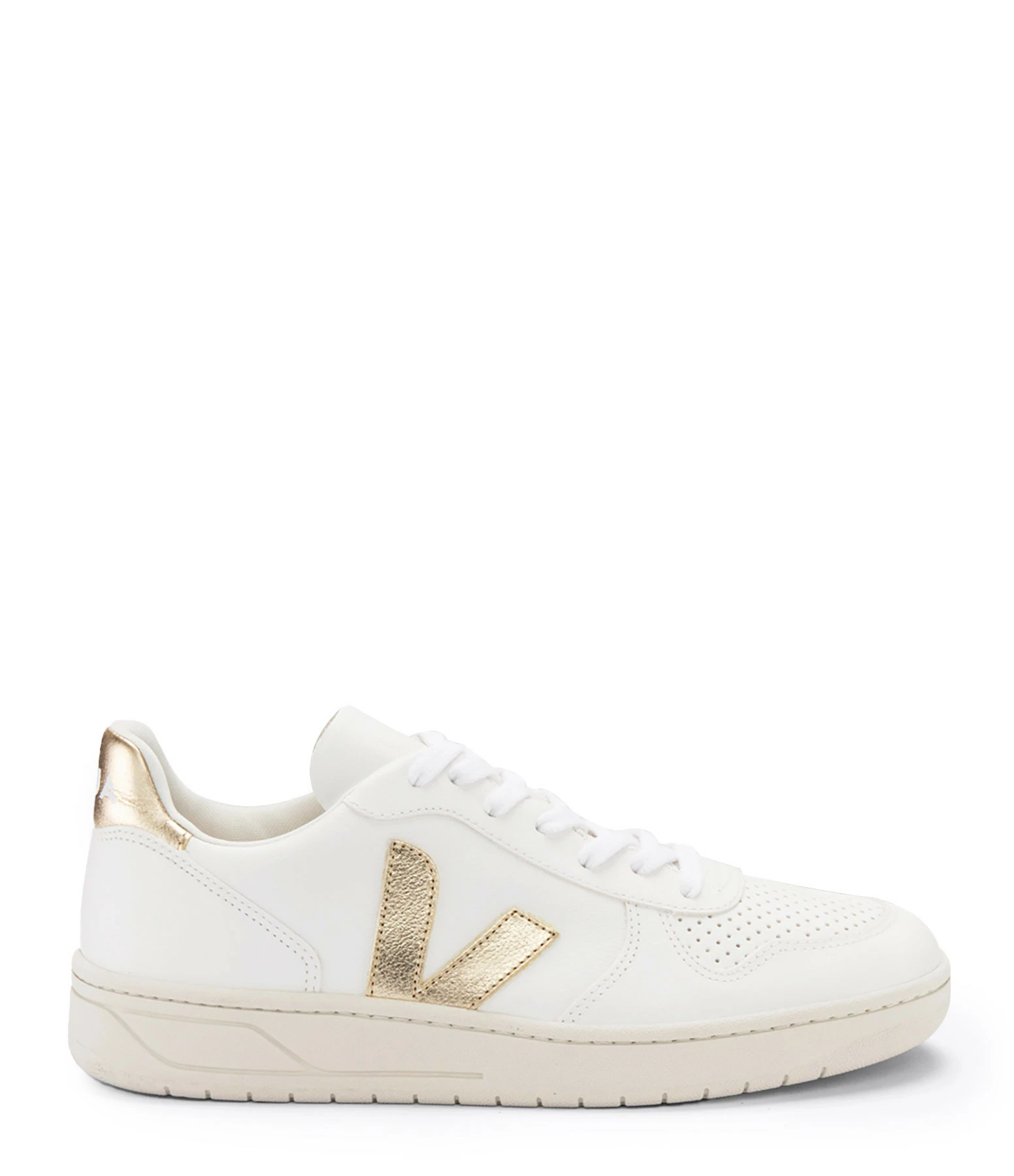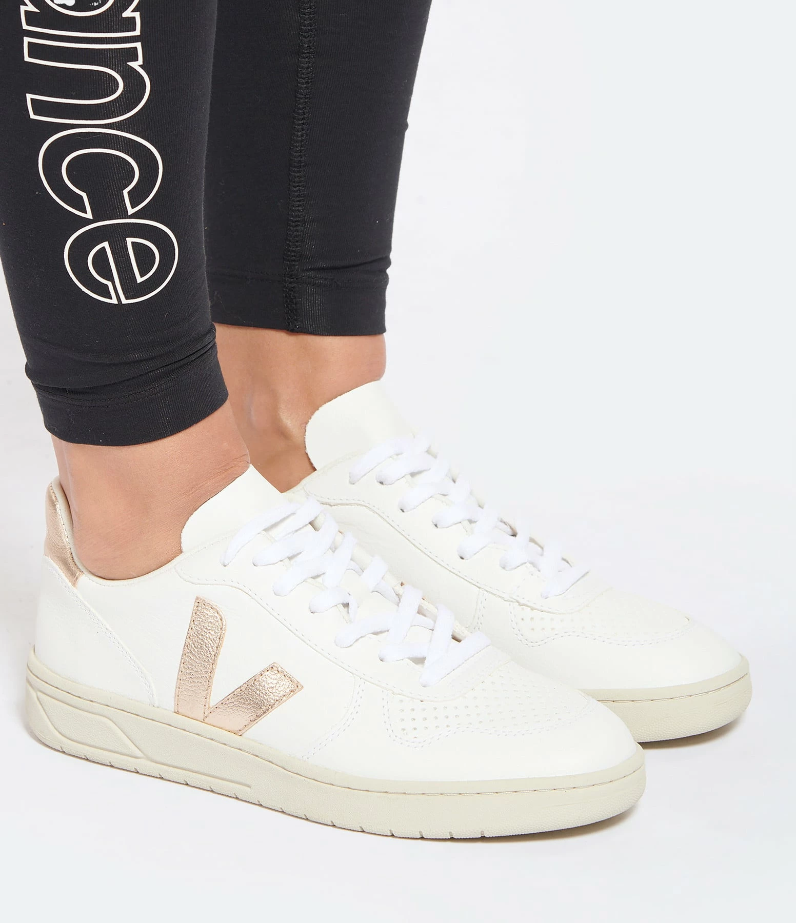 Baskets basses en cuir grainé blanc. Logo latéral “V” en cuir laminé rose doré. Lacets blancs en coton biologique.